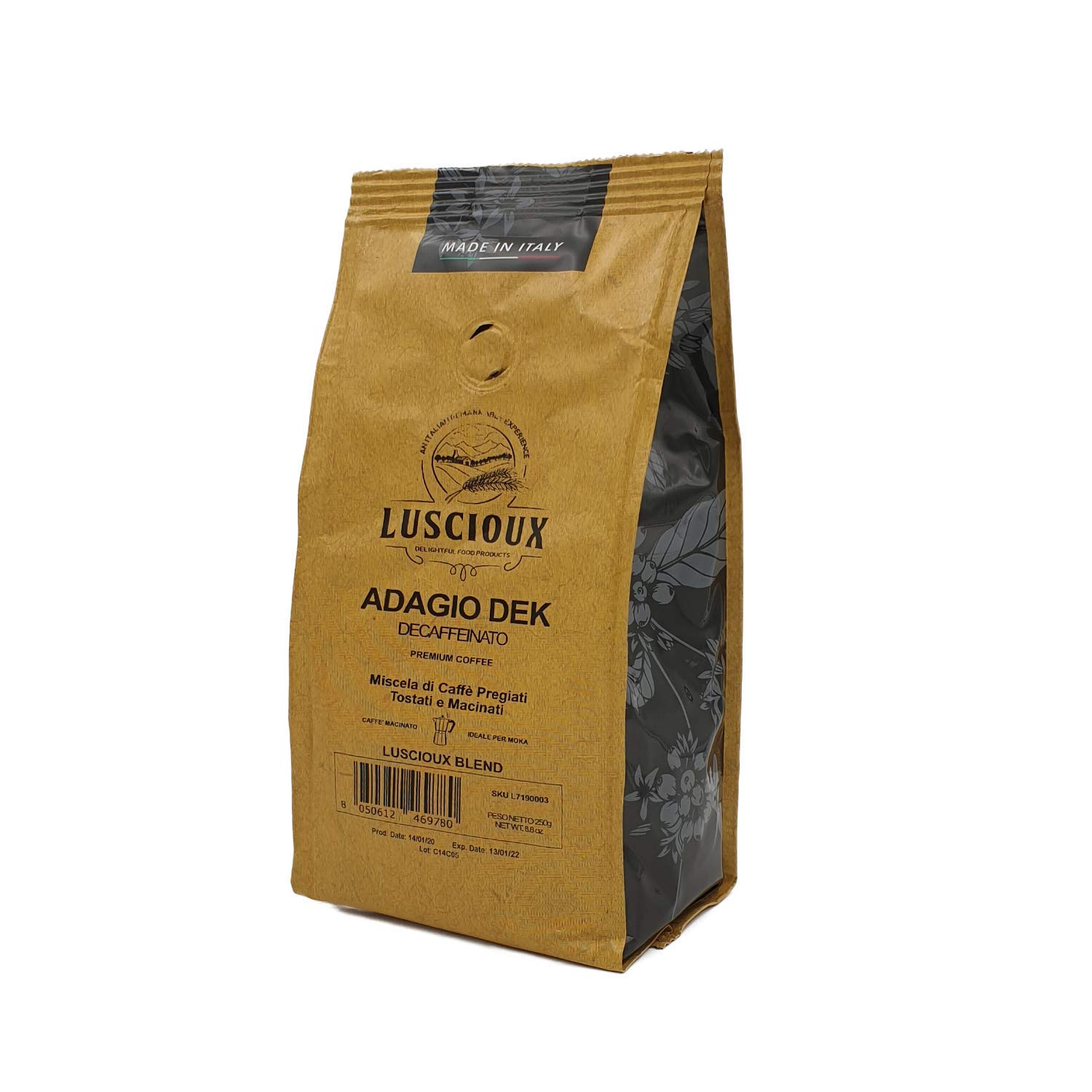 The unique taste of Luscioux ground coffee for mocha and espresso. Luscioux ground coffee is the result of extensive experience in the art of blending and roasting. Designed with specific grinding degrees for different preparations, Luscioux ground coffee allows you to create the coffee you love with the ritual you enjoy most. Luscioux Adagio Dek Decaffeinated Coffee: An aromatic and refined blend of Robusta and Arabica coffee. Appearance: Hazelnut cream without nuances. Aroma: Sweet notes of almond and chocolate with hints of dried fruit. Medium roast. INGREDIENTS coffeeHazelnut cream. Aroma: Sweet notes of almond and chocolate with hints of dried fruit. An aromatic and refined blend of Robusta and Arabica coffee. For those who want to give up caffeine but not the pleasure of excellent coffee. For preparing 100 to 140 cups of coffee. 4 packs of 250g each of ground coffee for Moka 1kg of coffee in total. Le goût unique du café moulu Luscioux pour moka et expresso. Le café moulu Luscioux est le résultat d'une longue expérience dans l'art du mélange et de la torréfaction. Étudié avec des degrés de mouture spécifiques selon les différentes préparations, le café moulu Luscioux vous permet de créer le café que vous aimez avec le rituel que vous aimez le plus. Café décaféinés Luscioux Adagio Dek: Un mélange aromatique et raffiné de café Robusta et Arabica. Vue: crème de noisette sans nuances. Arôme: douces notes d'amande et de chocolat avec des notes de fruits secs. Torréfaction moyenne. INGRÉDIENTS caféCrème de noisette. Arôme: douces notes d'amande et de chocolat avec des notes de fruits secs. Un mélange aromatique et raffiné de café Robusta et Arabica. Pour ceux qui veulent renoncer à la caféine mais pas le plaisir d'un excellent café. Pour préparer 100 à 140 tasses de café. 4 paquets de 250 gr chacun de café moulu pour Moka 1 kg de café au total.