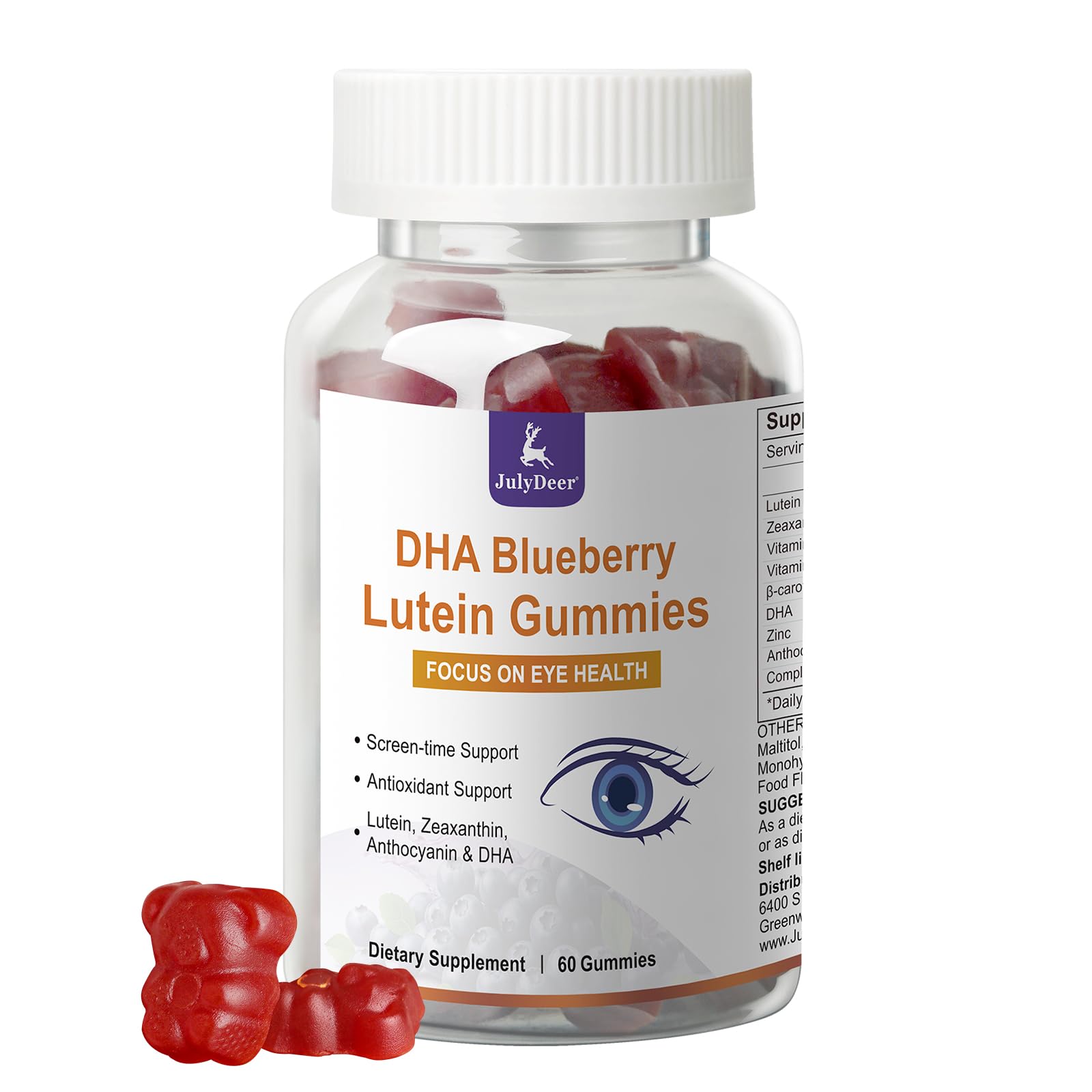 Premium Ingredients: take two easy-to-chew gummies daily for consistent eye support. The vegan, gluten-free, and non-GMO, JulyDeer capsules prioritize purity and quality. Ingredients are globally sourced and produced in a cGMP-certified facility, with rigorous third-party tesed audits ensuring safety and potency. . Potent Antioxidant Protection: formulated with Lutein (8mg) Zeaxanthin (1.6mg), plus Anthocyanin from Blueberry Extract, Vitamins C and E, these gummies provide antioxidant properties that help neutralize free radicals and shield your eyes from environmental damage. . Purely Delicious Clean Formula: enjoy a sweet orange flavor with every serving. Our gummies are carefully crafted to be Non-GMO, Vegan, and Gluten Free. They contain no gelatin, dairy, or common allergens, making them a pure and delicious part of your health routine. . Targeted Vision Comfort: specifically designed to support eye health, these supplements can help improve blurry spots, reduce feelings of eye fatigue and dryness, and provide essential daily nutrition. They are your perfect ally against the strain caused by digital screens like TVs, computers, and phones. . Comprehensive Eye Body Support: our 9-in-1 gummies are packed with Lutein, Zeaxanthin, and a powerful blend of Vitamins C, E, Beta-carotene, DHA, and more. This formula helps protect your eyes from oxidative stress and blue light while also promoting robust immunity and healthier-looking skin for overall wellness. .