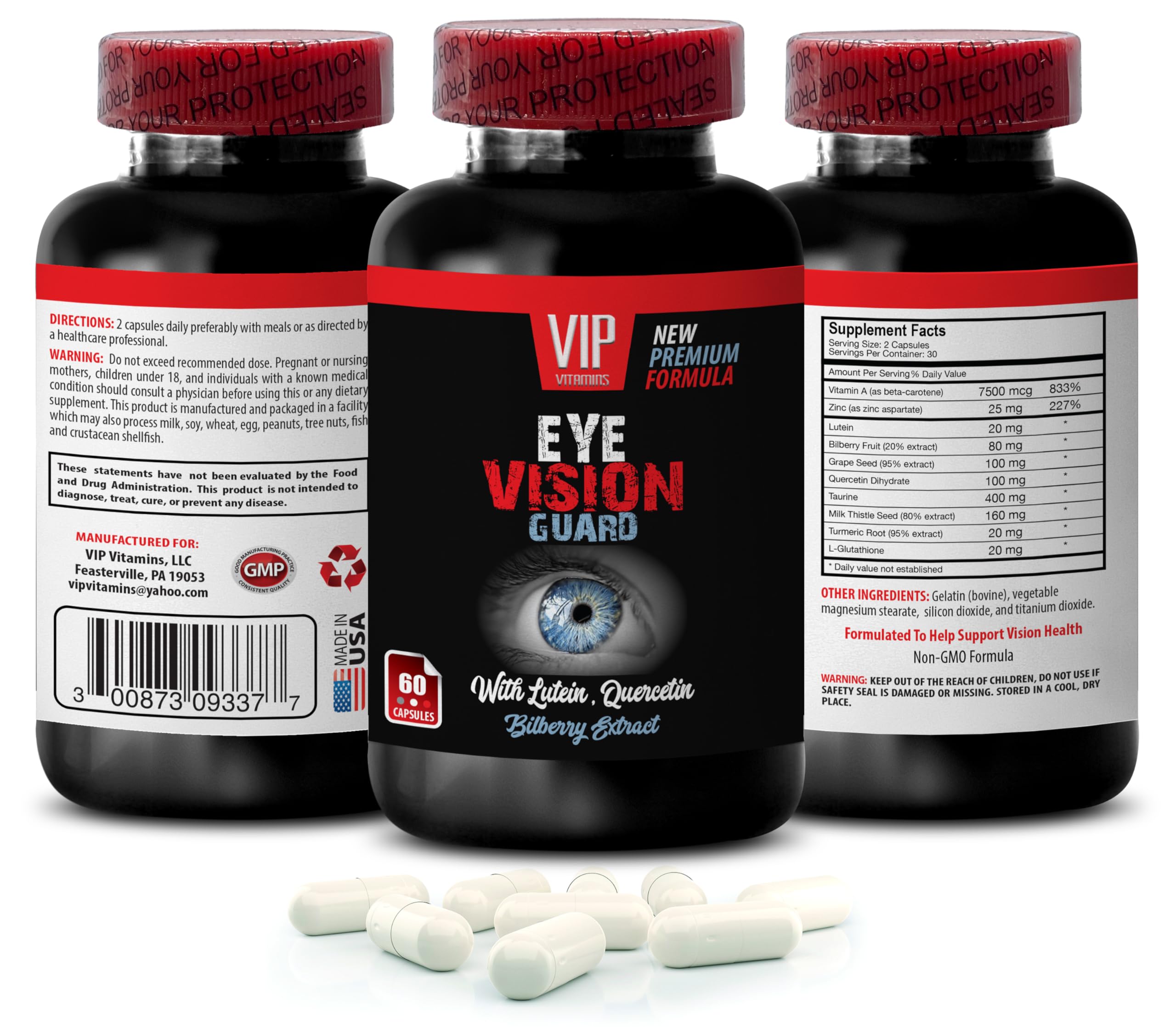 Lutein - EYE VISION GUARD - Bilberry Fruit, Grape Seed, Quercetin Dihydrate, Taurine, Milk Thistle Seed, Turmeric Root, L-Glutathione, Lutein, Bilberry Fruit, Taurine, Turmeric Root 1 Bottle 60 Capsules