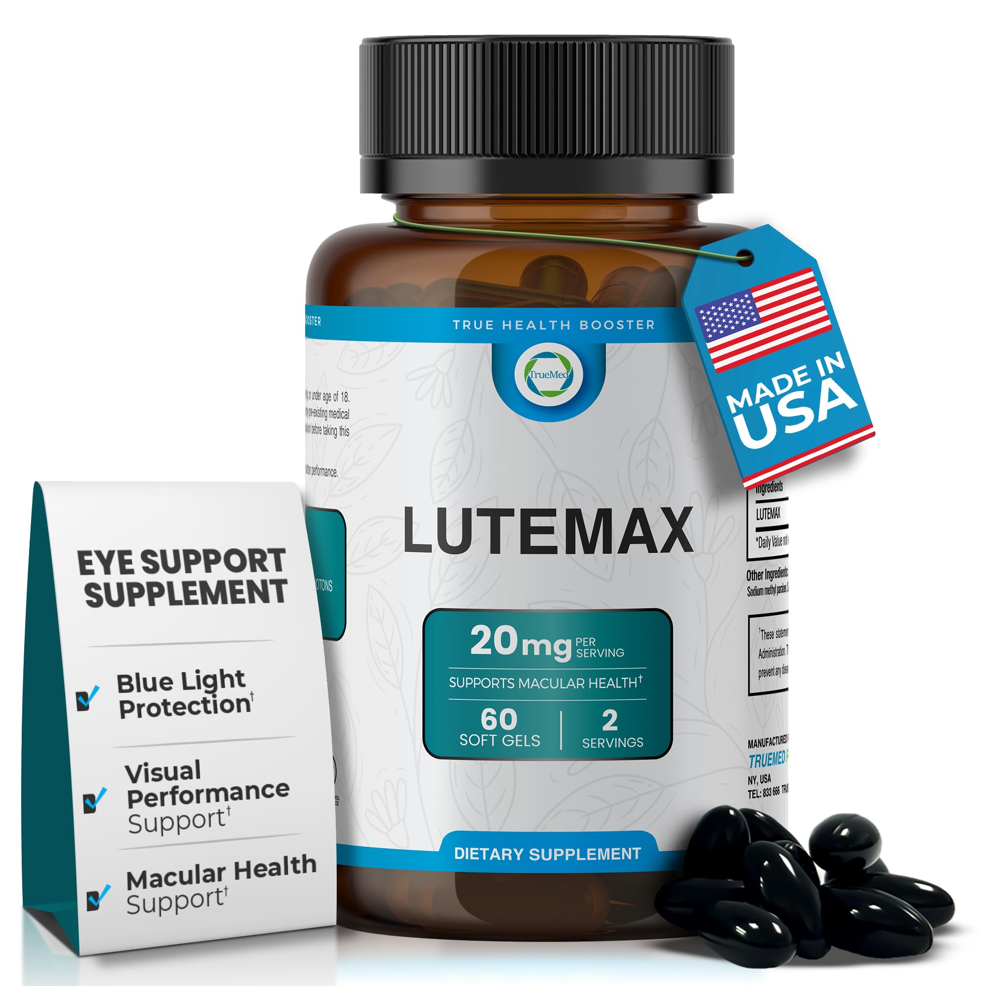 ✓ Supports Blue Light Protection: Lutemax may help protect the eyes from harmful blue light emitted by digital screens (phones, tablets, computers, etc.), which can contribute to digital eye strain. ✓TRUSTED BRAND EXPERT FORMULATION: TrueMed supplements deliver scientifically-backed formulations, offering trusted nutrition to support vision, heart, and overall wellness. ✓ NATURAL NON-GMO INGREDIENTS: TrueMed Lutemax 20 MG supplements are carefully crafted using non-GMO, high-quality ingredients, suitable for health-conscious consumers. ✓ PREMIUM QUALITY GMP CERTIFIED: Proudly manufactured in the USA under strict GMP-certified facilities, ensuring consistent purity, potency, and safety. ✓ PERFECT FOR DIGITAL AGE USERS: Ideal solution for students, professionals, and anyone regularly using digital screens, helping prevent digital eye strain and maintaining eye comfort. ✓ HIGH-QUALITY LUTEIN SOFTGELS: Each bottle contains 60 easy-to-swallow softgels, ensuring convenient daily intake to enhance vision and maintain eye comfort. ✓ ANTIOXIDANT EYE DEFENSE: Potent antioxidant properties may help fight oxidative stress, protecting delicate eye tissues and promoting long-term ocular health. ✓ BLUE LIGHT PHOTON PROTECTION: Shields eyes from harmful blue light and photons emitted by digital devices, minimizing eye strain and fatigue caused by screen exposure. ✓ ENHANCED MACULAR SUPPORT: Specifically formulated to protect and strengthen macular health, helping safeguard against age-related vision decline and macular degeneration. ✓ ADVANCED EYE HEALTH FORMULA: TrueMed Lutemax (20mg) Each serving delivers a potent dose to support optimal vision clarity, maintain overall eye health, and protect against eye strain for a more comfortable visual experience.