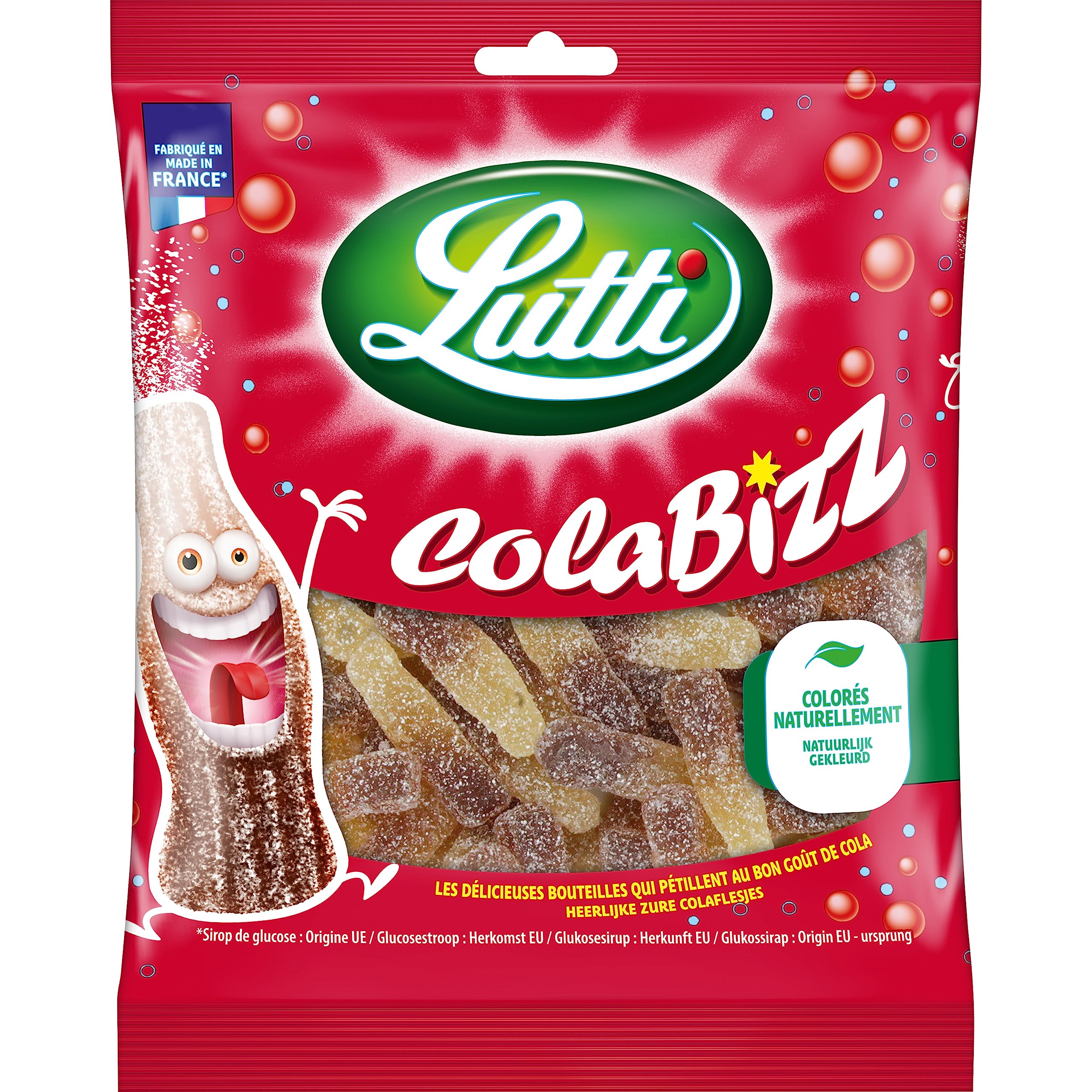 Lutti: The candies that fizz with pleasure. The pink and blue bottle, the cat's tongue, or the colorful threads—does that ring a bell? Of course, they're among the French's favorite candies, and at Lutti, we call them Bubblizz, Surffizz, and Scoubidou! What do they have in common? A fizz-terrifically good taste and infectious good cheer for 130 years! INGREDIENTS Glucose-fructose syrup, Sugar, Gelatin, Acids (Malic acid, Citric acid), Acidity regulator (Sodium malates), Caramelized sugar, Flavoring. INSTRUCTIONS FOR USE Consume directly from age 3. SAFETY WARNING For your health, avoid eating too much sugar or salt. See more