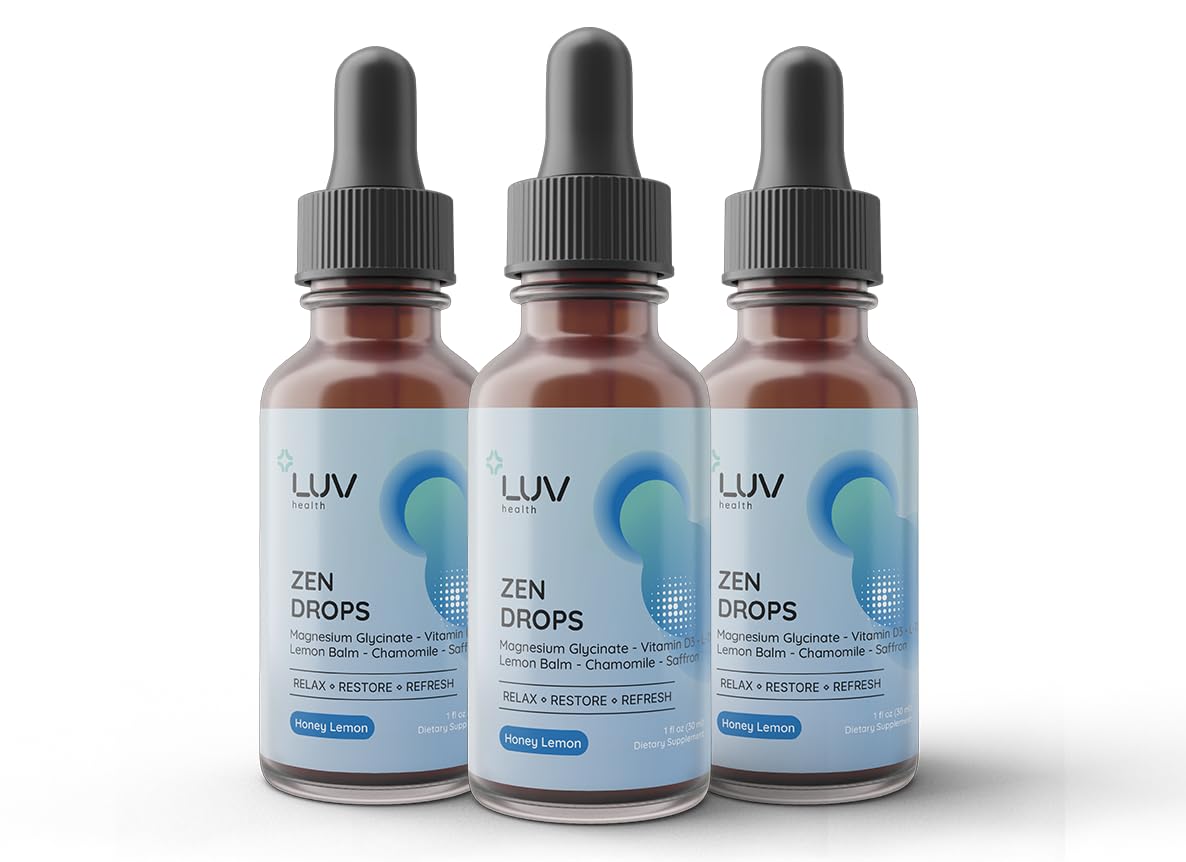 LUV Your Health Promise: If you're not fully satisfied with your purchase, our team is here to help. Every order is backed by our satisfaction guarantee. Key Ingredients: Magnesium Glycinate – Supports muscle function and a calm nervous system. Vitamin D3 – Helps maintain a positive mood and overall balance. L-Theanine – Promotes a calm focus without drowsiness. Lemon Balm – Traditionally used to support relaxation and everyday well-being. Chamomile – A gentle herb often used to encourage a sense of calm. Saffron – An adaptogen that helps support mood and emotional wellness. Made in the USA – Formulated with care and tested by third-party labs for quality and consistency. Clean Ingredients, Clear Intentions – Vegan, keto-friendly, soy-free, and gluten-free, LUV Zen Drops are crafted to fit a range of dietary needs without compromising quality. Fast-Absorbing Liquid Formula – Designed for easy use and quicker absorption than capsules or tablets. Mood Focus Support – A balanced blend of nutrients and botanicals to help support mental clarity and emotional well-being.
