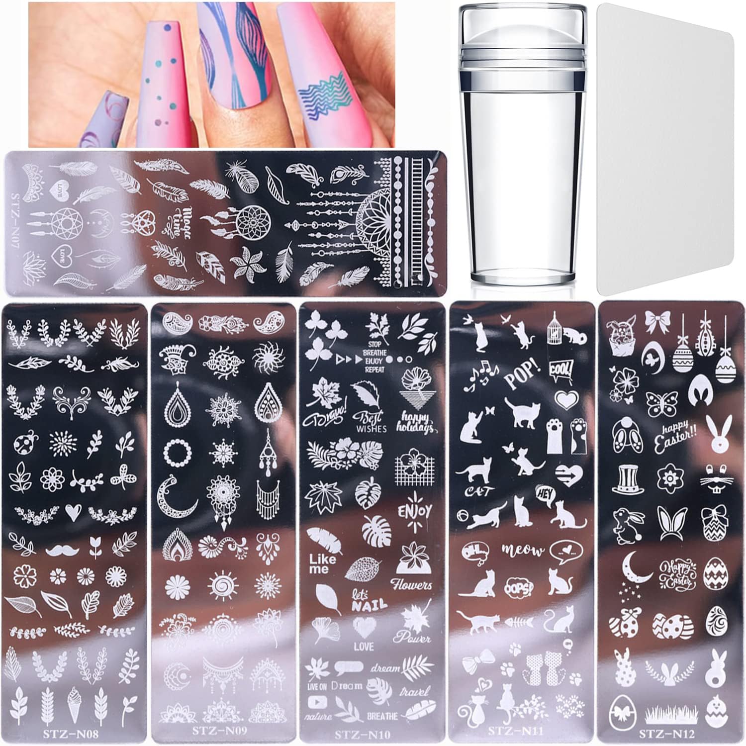Professional nail toolsNail art stamp set suitable for professionals and amateurs who love nails.If painting is difficult for you, Yangfei Nagel Stamping can help you solve this problem.You can easily create beautiful patterns during nail art.Easy to useYou don't have to paint every nail precisely and carefully.You only have to apply a reasonable amount of pressure adhesive to the stamp templates and then scrape the excess glue with a nail art scraper.After printing the pattern with the stamp, you can print the pattern on the nail.A variety of patternsEach nail blanket has different patterns: starry sky, animal, flower, heart, constellation, lace, stone, festival, etc. so that you can create unlimited color combinations of nail art design.Excellent materialThe template is made of high -quality stainless steel, is corrosion -resistant, durable and easy to clean.The scraper consists of high -quality PVC, which is easy, portable and easy to use.Nail Art Stamper consists of a transparent plastic shell and soft silicone, which can clearly print patterns, is easy to clean and can be reused.VALUE PackOur pack contains 6 pieces of rectangular nail stamp templates, 1 piece of stamp and 1 piece of scraper.These complete tools are sufficient for your daily DIY nail production.PROFESSIONELLE NAGELWERKZEUGENagelkunst Stempelset geeignet für Profis und Amateure, die Nägel lieben. Wenn das Malen für Sie schwierig ist, kann Ihnen Yangfei Nagel Stamping Schablonen helfen, dieses Problem zu lösen. Sie können leicht schöne Muster während der Nagelkunst erstellen. EINFACH ZU BEDIENENSie müssen nicht jeden Nagel präzise und sorgfältig lackieren. Sie müssen nur eine angemessene Menge Druckkleber auf die Stempelschablonen auftragen und dann den überschüssigen Kleber mit einem Nail Art Schaber abkratzen. Nachdem Sie das Muster mit dem Stempel gedruckt haben, können Sie das Muster auf den Nagel drucken. VIELFÄLTIGE MUSTERJede Nagelprägeplatte hat verschiedene Muster: Sternenhimmel, Tier, Blume, Herz, Sternbild, Spitze, Stein, Festival usw., damit Sie unbegrenzte Farbkombinationen von Nail Art Design erstellen können. HERVORRAGENDES MATERIALDie Schablone besteht aus hochwertigem rostfreier Stahl, ist korrosionsbeständig, langlebig und leicht zu reinigen. Der Schaber besteht aus hochwertigem PVC, das leicht, tragbar und einfach zu bedienen ist. Nail Art Stamper besteht aus einer transparenten Kunststoffschale und weichem Silikon, das Muster klar bedrucken kann, leicht zu reinigen ist und wiederverwendet werden kann. VALUE PACKUnser Pack enthält 6 Stück rechteckige Nagelstempelschablonen, 1 Stück Stempel und 1 Stück Schaber. Diese kompletten Werkzeuge reichen für Ihre tägliche DIY-Nagelerstellung.Luvadeyo Nail Art Plates, 6 Stück Nail Stamping Plate, Nagel Stamping Schablonen, mit 1 Stück Transparent Stempel, 1 Stück Schaber (Traumfänger, Gras, Muster, Blätter, Hase, Katze)