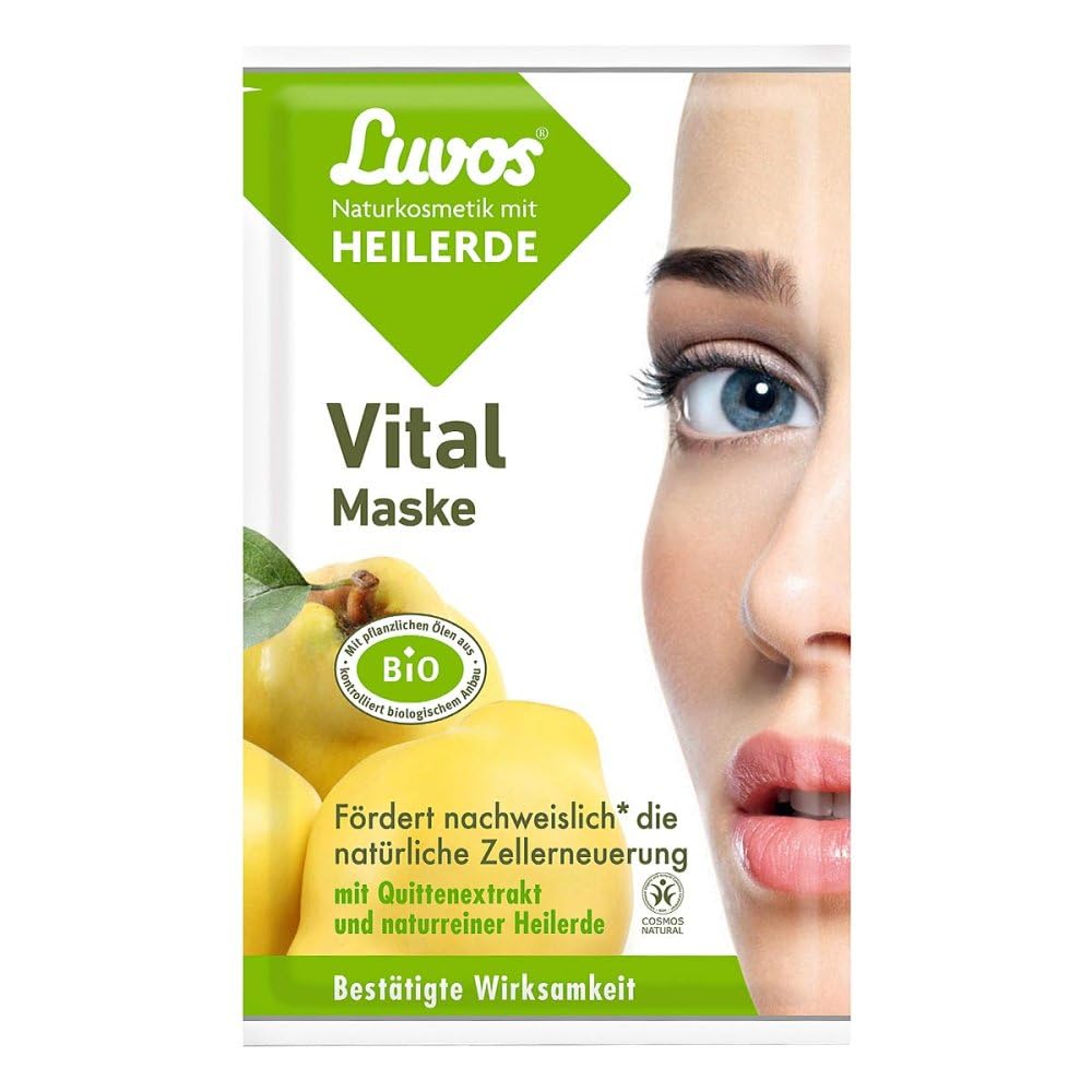 Ingredients: Aqua, Sorbitol, Helianthus Annuus (Sunflower) Seed Oil , Alcohol, Loess, Glyceryl Stearate Citrate, Glycerol Alcohol, Glyceryl Stearates, Aleurites Seed Oil, Ubiquinone To Amara Flower Extract ,Prunus amygdalus dulcis (Sweet Almond) Oil , Magnesium Aluminum Silicate, Xanthan Gum, Palmitic Acid, Stearic Acid, Tocopherol, Levulinic ACID, Sodium Levulinate, Soda Hydroxide, Parfum (Natural Essential Oils), Limonene , Linalool , Geraniol , Citral , Benzyl Salicylate , CI 77891 (Titanium dioxide), CI 77492 (Iron Hydroxides). Raw materials from controlled organic cultivation components of natural perfume oil Knead the unopened bag.Apply the mask evenly to the face, neck (and cleavage), leave the eye and mouth of the mouth free.After about 10–15 minutes, rinse the dried mask with lukewarm water or rub off with a cloth for intensive peeling.The Luvo's healing earth vital mask gives every skin type a pure and fresh complexion.The fine cleaning cream can be applied easily and evenly and later easily remove with water and a cosmetic pad removed-this additionally supplies and lets the skin shine rosy and healthy. Ingredients ingredients Aqua, Sorbitol, Helianthus Annuus (Sunflower) Seed Oil , Alcohol, Loess, Glyceryl Stearate Citrate, Cetearyl Alcohol, Glyceryl Stearate, Aleurites Moluccanus Seed Oil, Ubiquinone Flower Extract , Prunus AmygdalusDulcis (Sweet Almond) Oil , Magnesium Aluminum Silicate, Xanthan Gum, Palmitic Acid, Stearic Acid, Tocopherol, Levulinic Acid, Sodium Levulinate, Sodium Hydroxide, Parfum Instructions Knead the unopened bag.Apply the mask evenly to the face, neck (and cleavage), leave the eye and mouth of the mouth free.After about 10–15 minutes, rinse the dried mask with lukewarm water or rub off with a cloth for intensive peeling.The Luvo's healing earth vital mask gives every skin type a pure and fresh complexion Warnings Tip: Subsequently, use the built -up (link PZN 09488440 ""Luvos Naturalkosmetik tinted face fluid light""} Luvos facial fluid { link} then use. LEGAL NOTICE Read the package supplement and ask your doctor or pharmacist for risks and side effects. Morefree -selling.15 ml face mask.PZN-10739841.Zutaten:AQUA, SORBITOL, HELIANTHUS ANNUUS (SUNFLOWER) SEED OIL , ALCOHOL, LOESS, GLYCERYL STEARATE CITRATE, GLYCERIN, CETEARYL ALCOHOL, GLYCERYL STEARATE, ALEURITES MOLUCCANUS SEED OIL, UBIQUINONE, PYRUS CYDONIA FRUIT EXTRACT, CITRUS AURANTIUM AMARA FLOWER EXTRACT , PRUNUS AMYGDALUS DULCIS (SWEET ALMOND) OIL , MAGNESIUM ALUMINUM SILICATE, XANTHAN GUM, PALMITIC ACID, STEARIC ACID, TOCOPHEROL, LEVULINIC ACID, SODIUM LEVULINATE, SODIUM HYDROXIDE, PARFUM (NATURAL ESSENTIAL OILS), LIMONENE , LINALOOL , GERANIOL , CITRAL , BENZYL SALICYLATE , CI 77891 (TITANIUM DIOXIDE), CI 77492 (IRON HYDROXIDES). Rohstoffe aus kontrolliert biologischem Anbau Bestandteile des natürlichen Parfümöls Ungeöffneten Beutel durchkneten. Die Maske gleichmäßig auf Gesicht, Hals (und Dekolleté) auftragen, dabei Augen- und Mundpartie frei lassen. Nach ca. 10–15 Minuten die angetrocknete Maske mit lauwarmem Wasser abspülen oder zum intensiven Peeling mit einem Tuch abrubbeln. Die Luvos Heilerde Vital Maske schenkt jedem Hauttyp einen reinen und frischen Teint. Die feine Reinigungs-Creme lässt sich leicht und gleichmäßig auftragen und später ganz einfach mit Wasser und einem Kosmetikpad massierend wieder abnehmen – das durchblutet zusätzlich und lässt die Haut rosig und gesund strahlen. INHALTSSTOFFE ZUTATEN AQUA, SORBITOL, HELIANTHUS ANNUUS (SUNFLOWER) SEED OIL , ALCOHOL, LOESS, GLYCERYL STEARATE CITRATE, GLYCERIN, CETEARYL ALCOHOL, GLYCERYL STEARATE, ALEURITES MOLUCCANUS SEED OIL, UBIQUINONE, PYRUS CYDONIA FRUIT EXTRACT, CITRUS AURANTIUM AMARA FLOWER EXTRACT , PRUNUS AMYGDALUS DULCIS (SWEET ALMOND) OIL , MAGNESIUM ALUMINUM SILICATE, XANTHAN GUM, PALMITIC ACID, STEARIC ACID, TOCOPHEROL, LEVULINIC ACID, SODIUM LEVULINATE, SODIUM HYDROXIDE, PARFUM GEBRAUCHSANWEISUNG Ungeöffneten Beutel durchkneten. Die Maske gleichmäßig auf Gesicht, Hals (und Dekolleté) auftragen, dabei Augen- und Mundpartie frei lassen. Nach ca. 10–15 Minuten die angetrocknete Maske mit lauwarmem Wasser abspülen oder zum intensiven Peeling mit einem Tuch abrubbeln. Die Luvos Heilerde Vital Maske schenkt jedem Hauttyp einen reinen und frischen Teint WARNHINWEISE Tipp: Für eine optimal gepflegte Haut anschließend das aufbauende {link pzn 09488440 ""Luvos Naturkosmetik getöntes Gesichtsfluid hell""}Luvos Gesichtsfluid{ link} verwenden. RECHTLICHE HINWEISE Zu Risiken und Nebenwirkungen lesen Sie die Packungsbeilage und fragen Sie Ihren Arzt oder Apotheker. Mehrfreiverkäuflich. 15 ml Gesichtsmaske. PZN-10739841.LUVOS Heilerde Vital Maske Naturkosmetik 2X7.5 ml