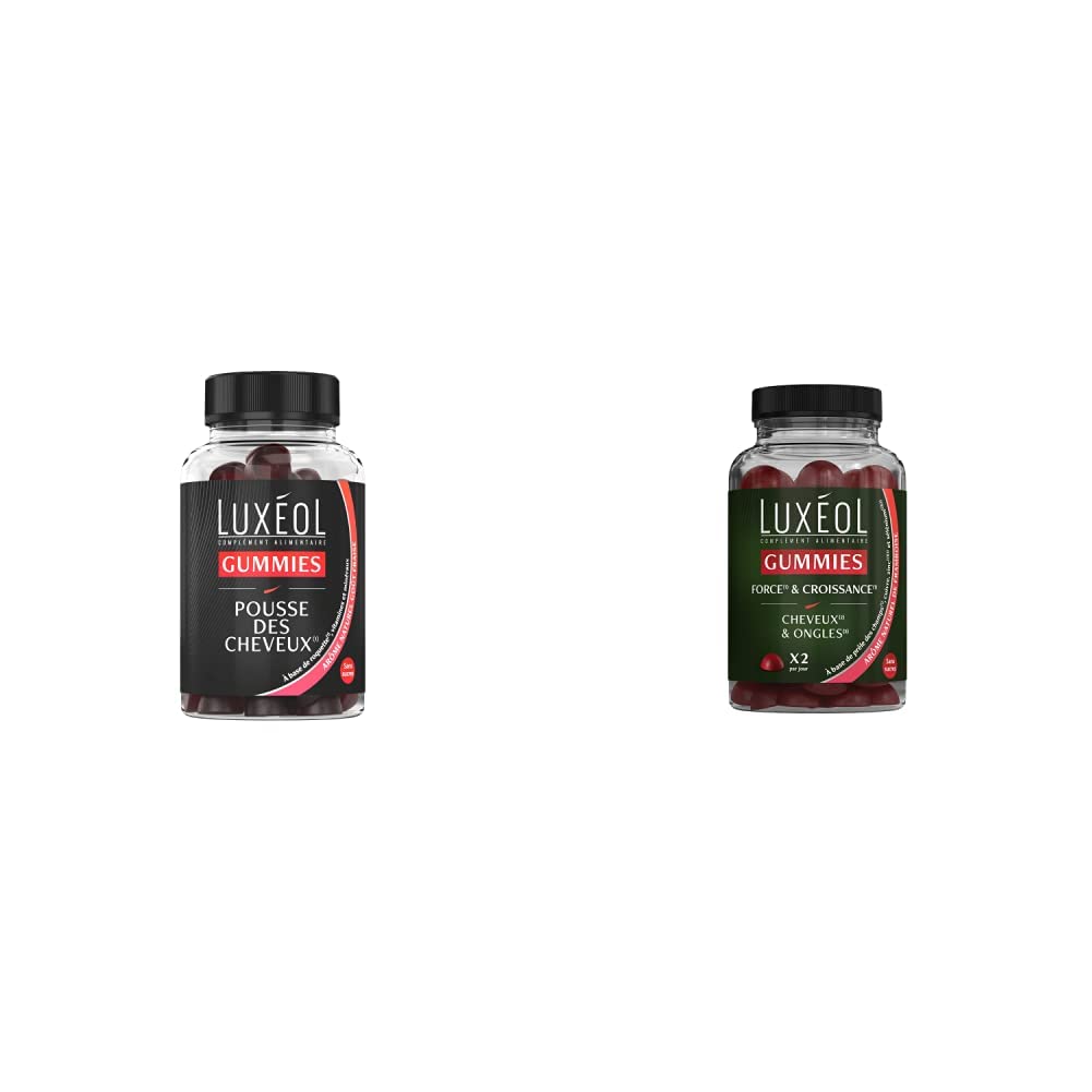 Luxéol – Hair Growth Gummies (1) – Sugar-Free – Natural Strawberry Flavor – Food Supplement – ??60 Gummies – 150 g. As a hair specialist, Luxéol offers a complete range of food supplements and cosmetics to help you achieve healthy hair. The Luxéol brand, an expert in its core business, is recognized for the reliability of its products and their conclusive results. Composed of high-quality ingredients in accordance with regulations, Luxéol hair products are meticulously researched, developed, and manufactured in specialized laboratories to provide the best solutions to the hair concerns of both women and men. Want to grow your hair (1)? Let yourself be tempted by Hair Growth Gummies and their strawberry flavor, a new Luxéol product! Food supplement based on rocquerre, zinc, vitamin B6, copper, selenium, and vitamin B8. (1) Rocket helps stimulate the hair bulb, promoting hair growth. (2) Zinc, selenium, and vitamin B8 contribute to the maintenance of normal hair. Copper contributes to normal hair pigmentation. Vitamin B6 contributes to normal cysteine ??synthesis. Directions for use: Take two gummies daily. Precautions: Not recommended for children 10 years and younger. Pregnant or breastfeeding women should consult a healthcare professional. Excessive consumption may have a laxative effect. Food supplements should be used as part of a healthy lifestyle and not as a substitute for a varied and balanced diet. Keep out of reach of young children. Do not exceed the recommended daily dose. Store away from moisture, heat, and light. Ingredients: Bulking agent: maltitol rocket (Eruca vesicaria) aerial part dry extract Gelling agent: pectin acidifier: sodium citrate acidifier: citric acid natural flavoring carrot and blackcurrant concentrate zinc citrate sodium selenite copper citrate pyridoxine hydrochloride (Vitamin B6) D-biotin (Biotin) vegetable oils (coconut and rapeseed) glazing agent: carnauba wax antioxidant: alpha-tocopherol. Rocket: origin Europe. Nutritional information (Amount per 2 gummies): Rocket aerial parts extract: 100 mg Zinc: 5 mg (50 of the NRV) Vitamin B6: 0.7 mg (50 of the NRV) Copper: 0.5 mg (50 of the NRV) Selenium: 27.5 micrograms (50 of the NRV) Biotin (Vitamin B8): 25 micrograms (50 of the NRV). Reference Intakes (RI): Net weight: 150g Luxéol – Strength (1) Growth (1) Gummies – For Hair (2) and Nails (3) – Food Supplement – ??60 Gummies – 180g As a hair specialist, Luxéol offers a range of food supplements and cosmetics to help you achieve radiant, beautiful hair. The Luxéol brand, an expert in its core business, is renowned for the reliability of its products and their conclusive results. Composed of high-quality ingredients in accordance with regulations, Luxéol hair products are meticulously researched, developed, and manufactured in specialized laboratories to provide the best solutions to the hair concerns of both women and men. Want to get stronger hair? Let yourself be seduced by the Strength and Growth Gummies and their exquisite taste, a new Luxéol product! Food supplement based on horsetail, copper, zinc, and selenium, with sweetener (1) Horsetail improves the condition and promotes the growth and strengthening of hair. (2) Selenium and zinc contribute to the maintenance of normal hair. (3) Selenium and zinc contribute to the maintenance of normal nails. (4) Copper contributes to normal hair pigmentation. Directions for use: Take two gummies daily. Precautions: Not recommended for children and adolescents. Pregnant or breastfeeding women should consult a healthcare professional. Excessive consumption may have a laxative effect. Food supplements should be used as part of a healthy lifestyle and not as a substitute for a varied and balanced diet. Keep out of reach of young children. Do not exceed the recommended daily dose. Store away from moisture, heat, and light. Ingredients: Sweetener: maltitol mineral mix: zinc citrate, copper gluconate, sodium selenate gelling agent: pectin acid: citric acid horsetail (Equisetum arvense) aerial part dry extract natural flavoring glazing agent: carnauba wax sunflower oil color: anthocyanins wheat starch. Horsetail: origin Europe. Net weight: 180g - 60 gummies. Amount per 2 gummies: Horsetail aerial part extract: 50 mg Zinc: 12.5 mg (Reference Intake: 125 ) Copper: 0.15 mg (Reference Intake: 15 ) Selenium: 82.5 µg (Reference Intake: 150 ). For your health, eat at least five fruits and vegetables a day. eatmove.Product 2: GROWTH (1): Give your hair growth a boost with horsetail, an ingredient that improves hair condition and promotes growth. Product 2: STRENGTH (1): Restore strength to weakened hair with the fortifying action (1) of these gummies. This food supplement also contributes to normal hair pigmentation (4). Product 1: MADE IN FRANCE: The result of years of research and development, this product is carefully designed and manufactured in France in a specialized laboratory. A practical and delicious food supplement! Product 1: NATURAL STRAWBERRY FLAVOR: Indulge in these delicious gummies. Their strawberry flavor will add a touch of sweetness to your day! Product 1: SUGAR-FREE: These gummies are sugar-free and made with arugula and a combination of minerals and vitamins selected for their beneficial properties. A formula to help you achieve your goals! Product 1: HELPING HAND: With their composition based on rocket, vitamins and minerals, these gummies help to stimulate the hair bulb and promote hair growth(1) to give your hair a boost.Luxéol – Gummies Pousse des Cheveux (1) – Sans Sucres – Arôme Naturel Goût Fraise – Complément Alimentaire – 60 Gummies – 150 g Spécialiste du cheveu, Luxéol propose une gamme complète de compléments alimentaires et cosmétiques pour vous aider à retrouver des cheveux en bonne santé. La marque Luxéol, experte sur son cœur de métier, est reconnue pour la fiabilité de ses produits et leurs résultats concluants. Composés d'ingréd