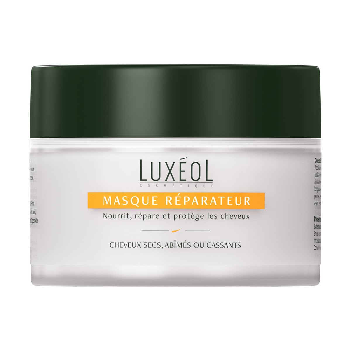 Hair specialist, Luxéol offers a complete range of food supplements and cosmetics (serum, mask, oil, shampoo, conditioner) to act on hair loss. Luxéol is committed to your well-being by conducting clinical studies and consumer tests for its cosmetics in order to bring you real and direct benefits. Meticulously studied, developed and manufactured in specialized laboratories, Luxéol cosmetic formulas are made up of quality ingredients. Our goal? Provide you with solutions to address your hair problems. Is your hair dry and damaged? Choose the combination of nutrition, repair and protection for your hair with the Luxéol Repair Mask! Results: (1) Suitable for dry, damaged (81 ) or brittle hair (77 ) (2) Nourishes hair: 82 (3) Repairs hair: 73 (4) Provides softness to hair: 79 (5) Protects dry, damaged or brittle hair: 76 (6) Facilitates detangling of hair: 89 (7) Respects hair: 89 . Consumer test on 62 people, satisfaction, after 21 days of use, two to three times a week. List of ingredients: Aqua, Cetearyl Alcohol, Distearoylethyl Dimonium Chloride, Butyrospermum Parkii Butter, Cetyl Esters, Ricinus Communis Seed Oil, Parfum, Sodium Benzoate, Citric Acid, Hydrogenated Castor Oil, Potassium Sorbate, Hydrolyzed Keratin, Panthenol, Copernicia Cerifera Cera, Sodium Hydroxide. Precautions for use: avoid contact with eyes. In case of contact with eyes, rinse thoroughly. Store at room temperature. Keep out of reach of children. INGREDIENTS Aqua, Cetearyl Alcohol, Distearoylethyl Dimonium Chloride, Butyrospermum Parkii Butter, Cetyl Esters, Ricinus Communis Seed Oil, Parfum, Sodium Benzoate, Citric Acid, Hydrogenated Castor Oil, Potassium Sorbate, Hydrolyzed Keratin, Panthenol, Copernicia Cerifera Cera, Sodium Hydroxide. DIRECTIONS FOR USE Apply 2 to 3 times a week to the ends of wet hair, leave on for 5 minutes, then rinse thoroughly. SAFETY WARNING Avoid contact with eyes. In case of contact with eyes, rinse thoroughly with clean water. Keep out of the reach of children. EASY TO USE: 2 to 3 applications per week on the ends of your wet hair help repair your hair (3) and make it soft (4). Leave on for 5 minutes then rinse thoroughly. TESTED under dermatological control. A real treatment for dry or damaged hair (6), consumers have testified to the visible results offered by the mask. FORMULA: Made in France, its formula combines ingredients selected for their qualities and their actions. PROTECTION: The treatment protects dry, damaged or brittle hair (5). Luxéol Repairing Mask, the solution against hair dryness that respects women's hair (7). NUTRITION: The rich and creamy texture of the Luxéol Repairing Mask nourishes the hair (2) and makes it soft (4). Your hair is nourished and becomes pleasantly softer. Spécialiste du cheveu, Luxéol propose une gamme complète de compléments alimentaires et de cosmétiques (sérum, masque, huile, shampooing, après-shampooing) pour agir sur la perte capillaire. Luxéol s'attache à votre bien-être en menant des études cliniques et tests consommateurs pour ses cosmétiques afin de vous apporter des bénéfices réels et directs. Minutieusement étudiées, élaborées et fabriquées dans des laboratoires spécialisés, les formules cosmétiques Luxéol sont constituées d'ingrédients de qualité. Notre objectif ? Vous apporter des solutions pour répondre aux problèmes de votre chevelure. Vos cheveux sont secs et abîmés ? Choisissez l'alliance nutrition, réparation et protection de votre chevelure avec le Masque Réparateur Luxéol ! Résultats : (1) Convient aux cheveux secs, abîmés (81 ) ou cassants (77 ) (2) Nourrit les cheveux : 82 (3) Répare les cheveux : 73 (4) Apporte douceur aux cheveux : 79 (5) Protège les cheveux secs, abîmés ou cassants : 76 (6) Facilite le démêlage des cheveux : 89 (7) Respecte les cheveux : 89 . Test consommateur sur 62 personnes, de satisfaction, après 21 jours d'utilisation, deux à trois fois par semaine. Liste des ingrédients : Aqua, Cetearyl Alcohol, Distearoylethyl Dimonium Chloride, Butyrospermum Parkii Butter, Cetyl Esters, Ricinus Communis Seed Oil, Parfum, Sodium Benzoate, Citric Acid, Hydrogenated Castor Oil, Potassium Sorbate, Hydrolyzed Keratin, Panthenol, Copernicia Cerifera Cera, Sodium Hydroxide. Précautions d'emploi : éviter tout contact avec les yeux. En cas de contact avec les yeux, rincer abondamment. Conserver à température ambiante. Conserver hors de portée des enfants. INGRÉDIENTS Aqua, Cetearyl Alcohol, Distearoylethyl Dimonium Chloride, Butyrospermum Parkii Butter, Cetyl Esters, Ricinus Communis Seed Oil, Parfum, Sodium Benzoate, Citric Acid, Hydrogenated Castor Oil, Potassium Sorbate, Hydrolyzed Keratin, Panthenol, Copernicia Cerifera Cera, Sodium Hydroxide. MODE D'EMPLOI Appliquez 2 à 3 fois par semaine sur les pointes des cheveux mouillés, laissez poser 5 minutes, puis rincez abondamment. AVERTISSEMENT DE SÛRETÉ Éviter tout contact avec les yeux. En cas de contact avec les yeux, rincer abondamment à l'eau claire. Conserver hors de la portée des enfants. FACILE À UTILISER : 2 à 3 applications par semaine sur les pointes de vos cheveux mouillés permettent de réparer vos cheveux (3) et de leur apporter de la douceur (4). Laissez agir 5 minutes puis rincez abondamment. TESTÉ sous contrôle dermatologique. Véritable soin pour les cheveux secs ou abîmés (6), les consommateurs ont témoigné des résultats visibles offerts par le masque. FORMULE : Fabriquée en France, sa formule associe des ingrédients sélectionnés pour leurs qualités et pour leurs actions. PROTECTION : Le soin protège les cheveux secs, abîmés ou cassants (5). Luxéol Masque Réparateur, la solution contre le dessèchement capillaire qui respecte les cheveux (7) des femmes. NUTRITION : La texture riche et onctueuse du Masque Réparateur Luxéol permet de nourrir les cheveux (2) et apporte douceur aux cheveux (4). Vos cheveux sont nourris et deviennent agréablement plus doux.