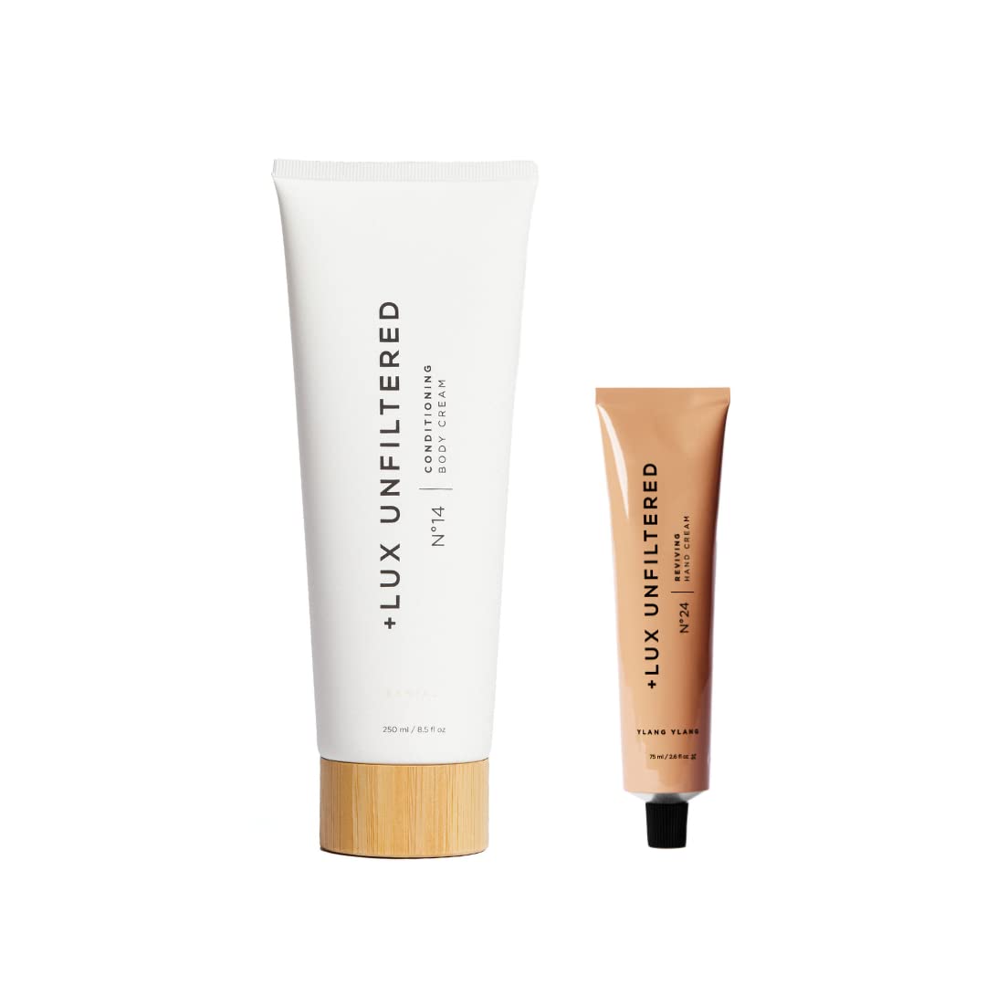 SEAL OF APPROVAL FROM INDUSTRY EXPERTS: Lux Unfiltered products have been featured in: Forbes, W Magazine, Byrdie, POPSUGAR, Allure, and more. CLEAN INGREDIENTS: Lux Unfiltered's products are vegan, cruelty-free, and gluten-free for the ultimate luxury self-care experience. N 14 and N 24 are free from harsh ingredients such as parabens, paraffins, phthalates, sulfates, and silicones. HYDRATED AF: Say NO to Winter skin and give your skin the hydration it deserves using N 24 Reviving Hand Cream N 14 Conditioning Body Cream. LUXURY MEETS HAND MOISTURIZER: N 24 effortlessly supports your skinâ€s elasticity, smoothness, and texture with skin loving cocoa seed butter, shea butter, argan oil, hyaluronic acid, squalane, and vitamin E. Quench your hands with this earthy and fresh Ylang Ylang scented hand cream for the feeling of ultimate luxury. OUR BODYâ€S NEW BFF: Meet N 14! Your new everyday, ultra-hydrating daily moisturizer that's loaded with antioxidants and skincare benefits with a Blood Orange luxury fragrance N 14 is loaded with jojoba oil, squalane, shea butter, vitamin C, hyaluronic acid to give your skin all the hydration it needs daily.