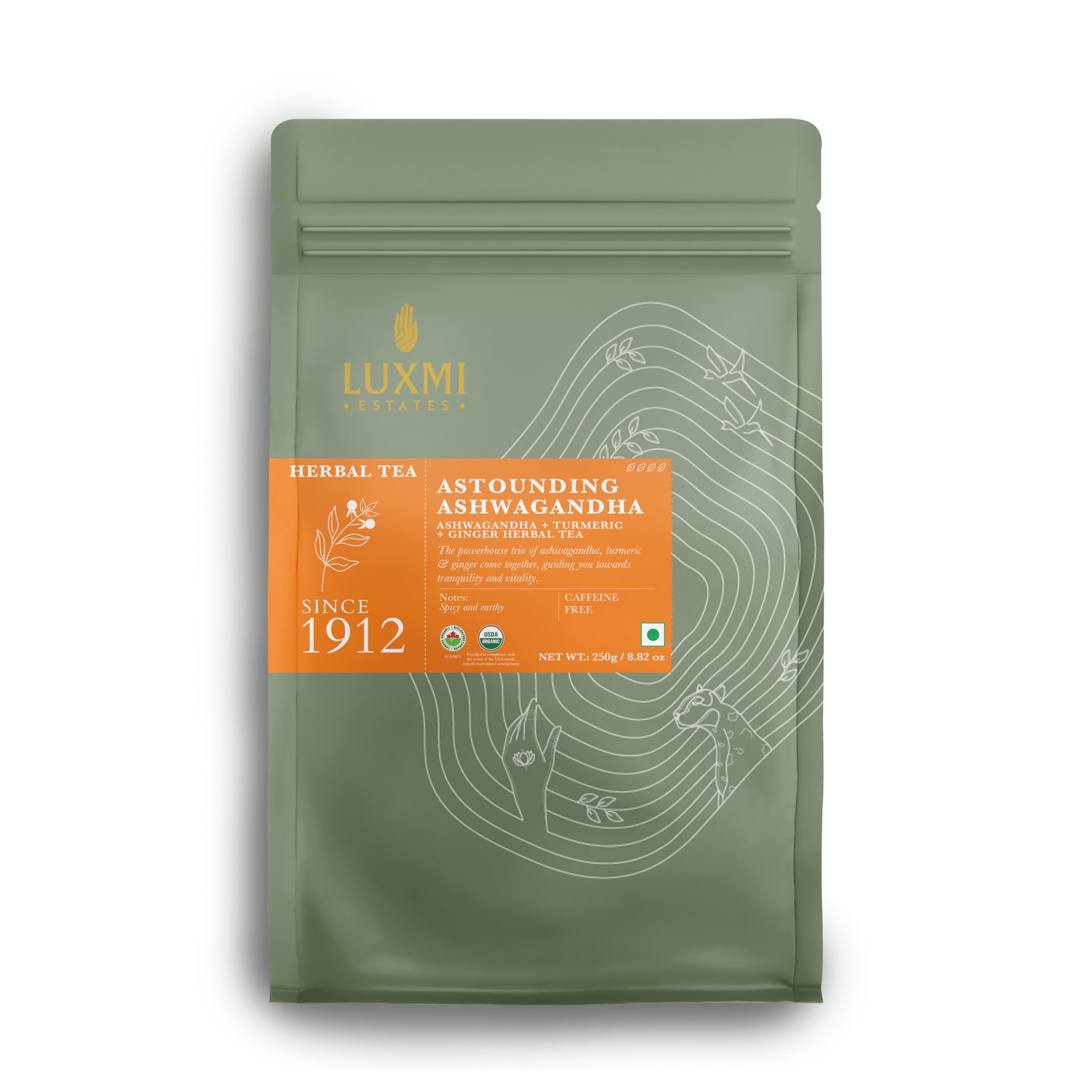 Luxmi Estates Astounding Ashwagandha Root Loose Tea 250g Pack Certified USDA Organic Herbal Tea for Stress Support with Turmeric Ginger Lemongrass and More 500 cups ashwagandha turmeric tea 250 Gm