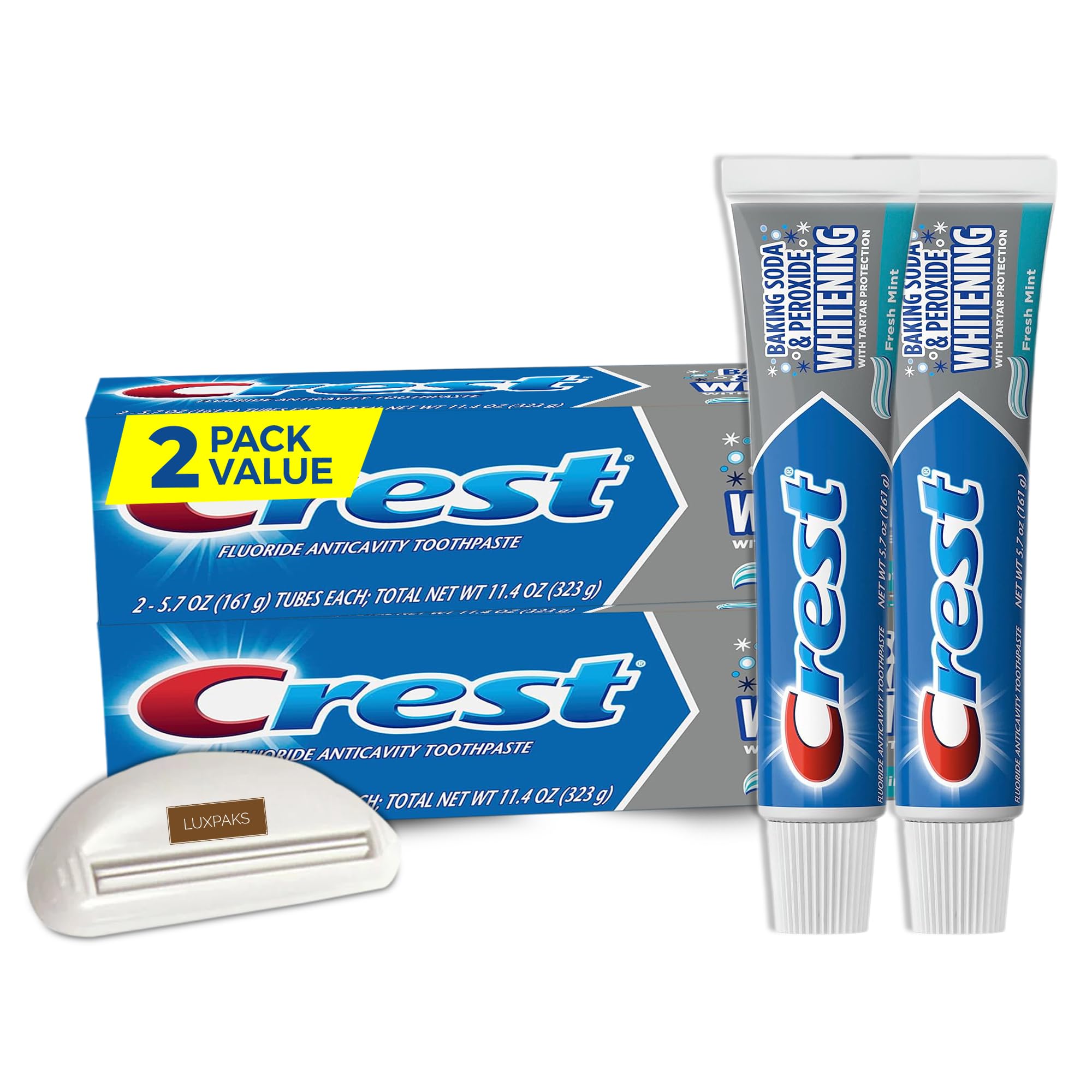 DESCRIPTION DU PRODUIT DESCRIPTION DU PRODUIT Upgrade your oral care routine with the LUXPAKS Squeezer and Cavity Tartar Protection Toothpaste, Whitening Baking Soda, 5.7 oz, Pack of 2. This bundle provides a powerful solution for maintaining a bright, healthy smile. The toothpaste combines the cavity-fighting power of Fluoride with the whitening effects of baking soda. This advanced formula helps to remove surface stains, fight tartar buildup, and strengthen weak spots in your teeth. The LUXPAKS Squeezer ensures that no toothpaste goes to waste, allowing you to use every last drop. It's designed for ease of use, making it perfect for all ages, and is compatible with various toothpaste brands. This bundle is ideal for those who want to maintain strong oral hygiene while maximizing the use of their toothpaste. MODE D'EMPLOI Appliquez une quantité de la taille d'un pois sur la brosse à dents, brossez en mouvements circulaires pendant 2 minutes, concentrez-vous sur toutes les surfaces des dents, rincez abondamment après le brossage. AVERTISSEMENT DE SÉCURITÉ Tenir hors de portée des enfants. Ne pas avaler. En cas d'ingestion, consultez immédiatement un médecin. Évitez tout contact avec les yeux. En cas de contact, rincer abondamment à l'eau. Voir plusGentle on Enamel: This toothpaste is gentle on tooth enamel, making it suitable for daily use while effectively cleaning and whitening your teeth. Advanced Cavity and Tartar Protection: The formula fights cavities, strengthens weak spots, and helps prevent tartar buildup for healthier teeth. Maximize Toothpaste Usage: The efficient LUXPAKS squeezer ensures no toothpaste is wasted, allowing you to make the most of every tube and save money. Whitening and Freshness: The Crest-toothpaste with baking soda whitens teeth by removing surface stains, while providing a fresh mint flavor that leaves your mouth feeling clean. Complete Oral Care Bundle: Includes LUXPAKS squeezer and Crest-Cavity Tartar Protection Toothpaste, Whitening Baking Soda, 5.7 oz, Pack of 2 for a comprehensive dental hygiene routine.CRST Cavity Tartar Protection Toothpaste, Whitening Baking Soda, 5.7 oz, Pack of 2 bundled with LUXPAKS SqueezerDESCRIPTION DU PRODUIT DESCRIPTION DU PRODUIT Upgrade your oral care routine with the LUXPAKS Squeezer and Cavity Tartar Protection Toothpaste, Whitening Baking Soda, 5.7 oz, Pack of 2. This bundle provides a powerful solution for maintaining a bright, healthy smile. The toothpaste combines the cavity-fighting power of Fluoride with the whitening effects of baking soda. This advanced formula helps to remove surface stains, fight tartar buildup, and strengthen weak spots in your teeth. The LUXPAKS Squeezer ensures that no toothpaste goes to waste, allowing you to use every last drop. It's designed for ease of use, making it perfect for all ages, and is compatible with various toothpaste brands. This bundle is ideal for those who want to maintain strong oral hygiene while maximizing the use of their toothpaste. MODE D'EMPLOI Appliquez une quantité de la taille d'un pois sur la brosse à dents, brossez en mouvements circulaires pendant 2 minutes, concentrez-vous sur toutes les surfaces des dents, rincez abondamment après le brossage. AVERTISSEMENT DE SÉCURITÉ Tenir hors de portée des enfants. Ne pas avaler. En cas d'ingestion, consultez immédiatement un médecin. Évitez tout contact avec les yeux. En cas de contact, rincer abondamment à l'eau. Voir plusGentle on Enamel: This toothpaste is gentle on tooth enamel, making it suitable for daily use while effectively cleaning and whitening your teeth. Advanced Cavity and Tartar Protection: The formula fights cavities, strengthens weak spots, and helps prevent tartar buildup for healthier teeth. Maximize Toothpaste Usage: The efficient LUXPAKS squeezer ensures no toothpaste is wasted, allowing you to make the most of every tube and save money. Whitening and Freshness: The Crest-toothpaste with baking soda whitens teeth by removing surface stains, while providing a fresh mint flavor that leaves your mouth feeling clean. Complete Oral Care Bundle: Includes LUXPAKS squeezer and Crest-Cavity Tartar Protection Toothpaste, Whitening Baking Soda, 5.7 oz, Pack of 2 for a comprehensive dental hygiene routine.
