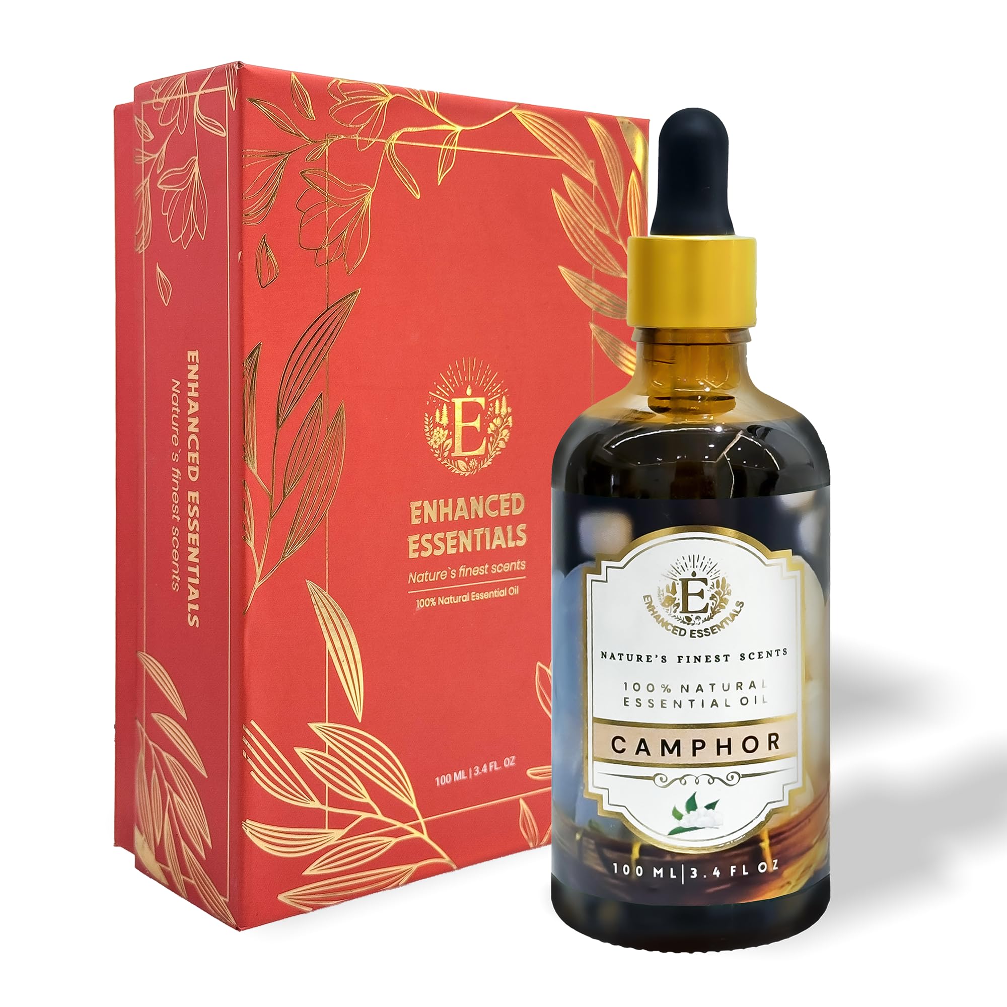 Experience the unparalleled purity and invigorating freshness of Enhanced Essentials Camphor Essential Oil. Encased in a sleek, sophisticated glass bottle, this luxurious essential oil not only ensures premium quality but also adds an elegant touch to your wellness collection. Distilled from the finest camphor trees, our Camphor Essential Oil captures the essence of nature's purity, offering a potent aroma that revitalizes and refreshes. With its distinctive, penetrating scent, Camphor Essential Oil is known for its ability to clear respiratory passages, soothe muscle aches, and reduce stress. The refreshing aroma acts as a natural pick-me-up, providing mental clarity and relaxation in equal measure. Enhanced Essentials Camphor Essential Oil is perfect for use in diffusers, massage and DIY beauty products, and it can even be used for natural household cleaning. Add a touch of luxury to your wellness routine with Enhanced Essentials Camphor Essential Oil, the ultimate blend of potency and sophistication. Aromatic Notes: Top Notes: Fresh, intense, and woody with a hint of eucalyptus. Middle Notes: Spicy, warm, and slightly sweet. Base Notes: Deep, earthy, and long-lasting. For Skin, Face and Hair applications dilute with a carrier oil like coconut oil,jojoba oil,pumpkin seed oil,black seed oil,avocado oil or almond oil. Why Choose Enhanced Essentials? At Enhanced Essentials, we are committed to providing you with the highest-quality essential oils. Our camphor oil is steam distilled to preserve its natural potency and invigorating fragrance. Each bottle is Pure Organic Natural and free from additives, fillers and synthetic ingredients, delivering the true scents of nature.Luxurious Packaging Ideal for Gifting: Our Camphor Essential Oil is encased in a beautifully designed, luxurious box with a 3.38 fl oz (100 ml) amber glass bottle that reflects the premium quality of the product inside. The elegant bottle and sophisticated box make it an ideal gift for loved ones, offering them the gift of tranquility and well-being.The precision glass dropper allows for easy and accurate application, making it both functional and stylish. Possible Blends with Enhanced Essentials with Camphor: Lavender Oil: The soothing properties of lavender complement the effects of camphor in creating a relaxing blend.Use ylang ylang essential oil for an exotic touch Lemongrass Essential oil: This blend is excellent for respiratory relief and creating a fresh, clean atmosphere. Peppermint Oil: Combining camphor with peppermint enhances the cooling and analgesic effects, making it great for massage therapy. Rosemary Oil: The stimulating and refreshing scent of camphor pairs well with rosemary oil for hair. Skin Soother: The cooling and soothing properties of camphor oil make it ideal for calming irritated skin, reducing redness and promoting a clear, healthy complexion. Versatile Use: Ideal for various applications, including aromatherapy, skincare, massage, and DIY beauty recipes. The gentle formula is suitable for all skin types.Use with tea tree oil for hair application. Aromatherapy Bliss: Enjoy the cool, invigorating aroma of camphor. Perfect for oil diffusers , it helps to purify the air, enhance mental clarity and create a refreshing atmosphere. Respiratory Support: Camphor essential oil is known for its ability to support clear breathing and reduce congestion. It helps to open up nasal passages and ease respiratory discomfort.Use with eucalyptus essential oil for better results. Experience the revitalizing and refreshing scent of Enhanced Essentials Camphor Essential Oil, a premium essential oil meticulously distilled from the finest camphor wood. This pure, therapeutic-grade oil captures the essence of camphor, offering a luxurious and invigorating experience for your mind and body.