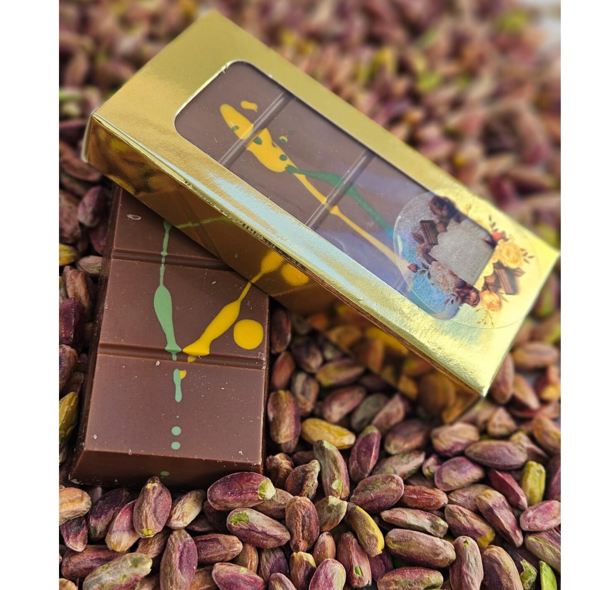 Indulge in the exquisite taste of Dubai pistachio chocolate, handcrafted in Belgium. This unique chocolate is a true taste experience that will enchant your palate. Fine Belgian chocolate is combined with crunchy pistachios to create an irresistible blend of sweetness and nuttiness. Each bar is an artisanal masterpiece, meticulously crafted by experienced artisans. Let yourself be pampered by the intense aromas and silky texture. This chocolate makes a perfect gift for yourself or your loved ones. Treat yourself to this luxurious indulgence and immerse yourself in the world of chocolate seduction. INGREDIENTS 50 milk chocolate (sugar, cocoa butter, whole milk powder, cocoa mass, emulsifier (soy lecithin), natural vanilla flavoring), 40 pistachio cream (pistachios, sugar), 10 cumin (wheat flour, corn starch, salt) INSTRUCTIONS Enjoy at room temperature See moreLUXURY Dubaï Chocolat pistache 100 g – Fabriqué à la main en chocolat belge, chocolat Dubaï Kadayif et pistache, chocolat Dubaï, chocolat DubaïDESCRIPTION DU PRODUIT DESCRIPTION DU PRODUIT Profitez de la délicatesse du chocolat pistache Dubaï fabriqué à la main en provenance de Belgique. Ce chocolat unique est une véritable expérience gustative qui enchantera votre palais. Le chocolat belge fin est associé à des pistaches croquantes pour créer un mélange irrésistible de douceur et de noisette. Chaque plaque est un chef-d'œuvre artisanal, soigneusement fabriquée par des artisans expérimentés. Laissez-vous dorloter par les arômes intenses et la texture soyeuse. Ce chocolat est un cadeau parfait pour vous-même ou vos proches. Offrez-vous ce plaisir luxueux et plongez dans le monde de la séduction du chocolat. INGRÉDIENTS 50 de chocolat au lait (sucre, beurre de cacao, poudre de lait entier, pâte de cacao, émulsifiant (lécithine de soja), arôme naturel de vanille), 40 crème de pistache (pistaches, sucre), 10 de cumin (farine de blé, amidon de maïs, sel) MODE D'EMPLOI À déguster à température ambiante Voir plus