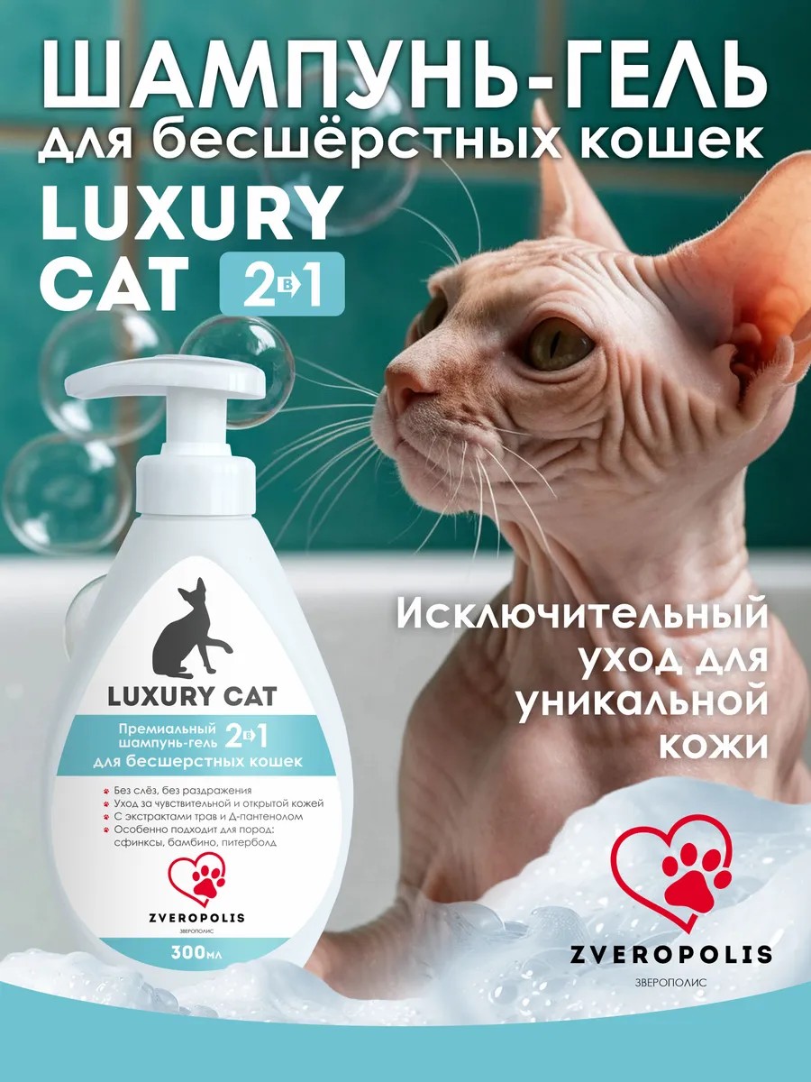 ZVEROPOLIS (Зверополис) LUXURY CAT — премиальный шампунь-гель 2в1 для бесшерстных кошек.