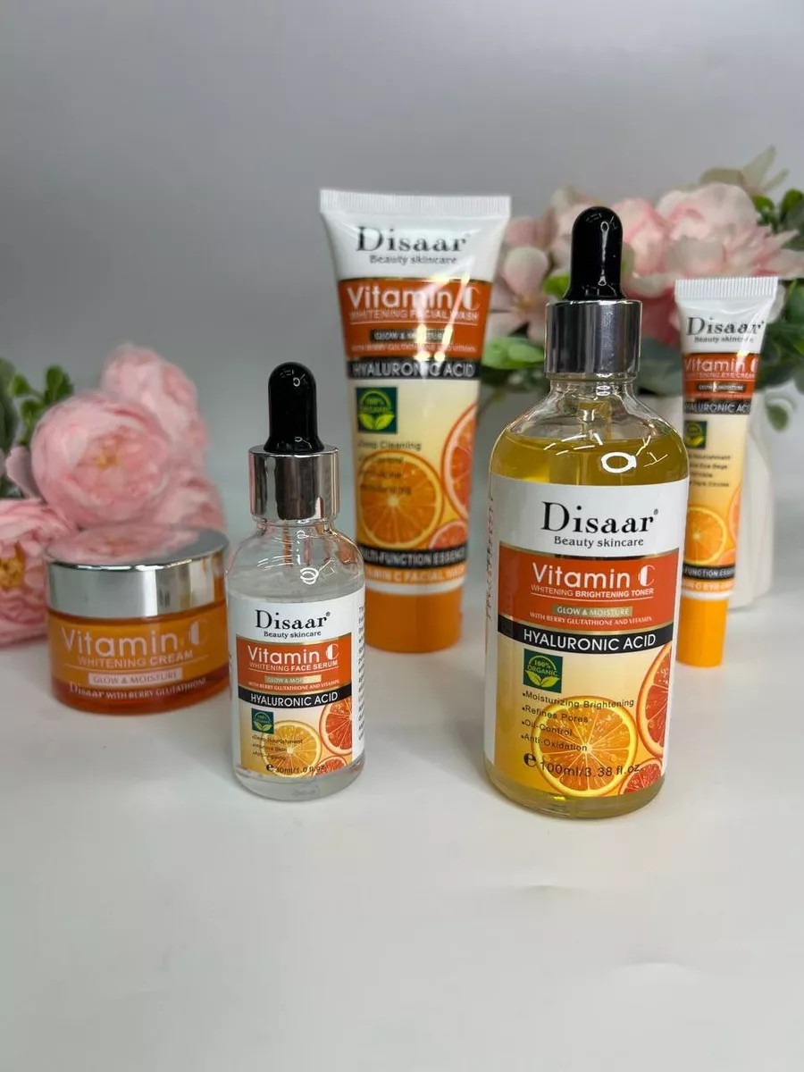 Косметический набор Disaar 5в1Омолаживающая система косметики для женщин VITAMIN-C с гиалуроновой кислотой - это инновационные косметические средства для лица и тела с натуральными маслами и природными омолаживающими элементами. Набор косметики поможет сохранить красоту и молодость кожи, сделает ее упругой, гладкой и сияющей. Этот косметический набор приятный подарок любой женщине! Жене, маме, бабушке, сестре, подруге, коллеге на любой праздник, будь то день рождения юбилей, новый год или корпоратив.. В составе омолаживающего набора: 1. Пенка для умывания. Этот мягкий и освежающий продукт предлагает нежную и густую пену, глубоко очищает поры, поглощает жир, грязь и остатки макияжа, восстанавливает поврежденную кожу, уменьшает морщины.