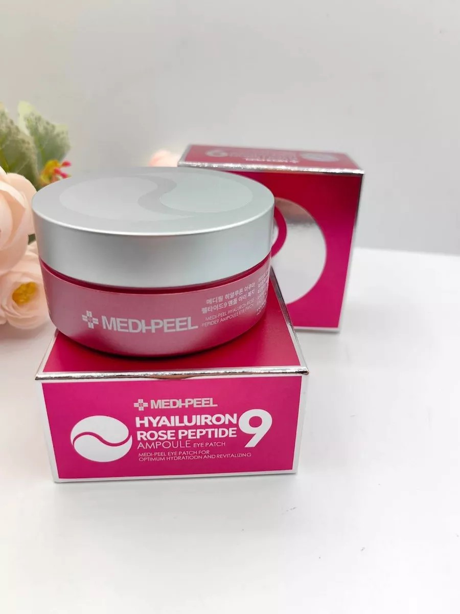 MEDI PEEL Hyaluron Patches with Peptides and Bulgarian Rose. MEDI-PEEL Hyaluron Rose Peptide 9 Ampoule Eye Patch hydrogel patches with rose extract and peptides also contain a vitamin complex and have an intense moisturizing, refreshing, and toning effect. They help eliminate puffiness, relieve swelling, slightly lighten dark circles, and refresh tired skin. The patches contain 3 different complexes at once: Rose Flower Complex - contains a large amount of polyphenols, glucosides, and carotenoids, has a pronounced antioxidant effect. Increases skin elasticity, has a vitaminizing, anti-inflammatory, and toning effect on the skin, accelerates regeneration processes, improves complexion, and gently brightens. Berry Complex - inhibits the synthesis of an enzyme that destroys collagen in epidermal cells and accelerates the production of its own collagen.
