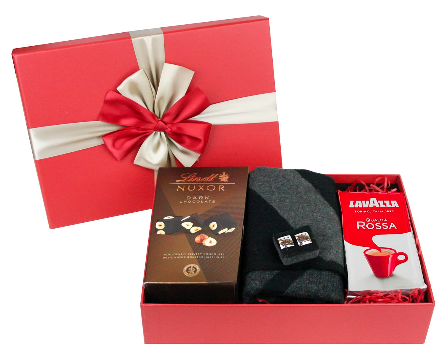 Simply classic luxury bow design red gift box - it looks so good you dont need to wrap it!. Enjoy super-fast, super-reliable delivery. Delivered in a high Quality packaging - packed with care so the box will be delivered in perfect shape and condition. The Gift Hamper contains: 1 Black Grey Scarf 1 Pair of Cufflinks 1 Lavazza Qualita Rossa coffee 250g and Lindt Nuxor Dark Chocolate 165g. Keeps your loved one warm and cosy. Perfect Gift for Him - Great for any occasion, supplied in a Luxury Gift Box!.