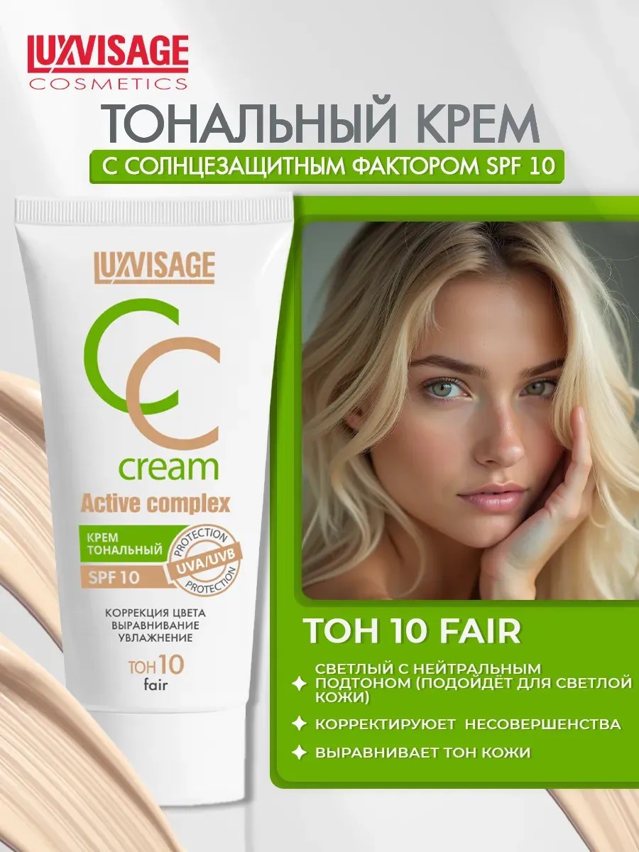 Крем тональный CC Active Complex SPF 10 от белорусского бренда LUXVISAGE — это идеальное решение для создания безупречного тона лица. СС крем сочетает в себе уход за кожей и декоративную косметику, обеспечивая легкое и естественное покрытие. Формула тонального крема для лица включает в себя увлажняющие компоненты, такие как глицерин и аква, которые помогают поддерживать оптимальный уровень влаги и защищают кожу от негативного воздействия окружающей среды. СС крем luxvisage содержит специальные фильтры, которые обеспечивают защиту от солнечных лучей, что делает его отличным выбором для повседневного использования. Тональный крем матовый подходит для всех типов кожи: сухой, чувствительной, смешанной и возрастной. Его легкая текстура позволяет легко распределяться по лицу, создавая идеальную основу под макияж. Тональная основа обеспечивает матирующий эффект, скрывая несовершенства и придавая коже здоровый вид. Тональный крем для лица матирующий для лица содержит компоненты, которые помогают контролировать блеск в течение дня, что делает его отличным выбором для тех, кто предпочитает матовую тоналку для лица. Тональник для лица прекрасно подходит как для ежедневного использования, так и для особых случаев, обеспечивая стойкость и комфорт на протяжении всего дня. Попробуйте тональный крем для лица матирующий натуральный от LUXVISAGE и откройте для себя секрет идеального тона лица. Тоналка для лица станет вашим надежным помощником в уходе за лицом и создании безупречного макияжа!
