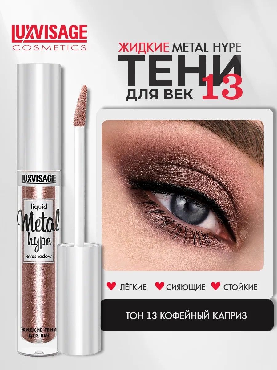 Long-lasting liquid eyeshadow "Metal Hype" from the Belarusian brand LUXVISAGE is an essential product for stunning eye makeup with a vibrant metallic shine. The weightless, creamy texture applies comfortably in a perfectly even layer, distributes evenly, builds up, and blends to the desired density, leaving no residue on the eyelids. Rich shades with a high content of pearlescent pigments create a dense, radiant finish from the first application, dry quickly, resist smudging or creasing, and maintain vibrant color all day long. The special formula allows for use without a primer. Easily removed with any makeup remover. Contains moisturizing and softening ingredients that gently care for delicate skin. For effective use, apply with an applicator or brush; for a translucent glow, blend with your fingertips. Luxe Visage decorative cosmetics from Belarus are of excellent quality and will be a wonderful addition to any woman's makeup bag.