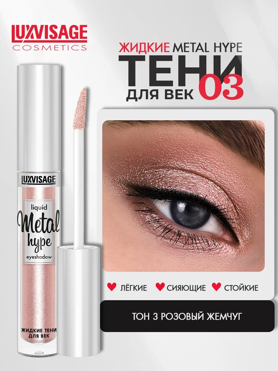 Long-lasting liquid eyeshadow "Metal Hype" from the Belarusian brand LUXVISAGE is an essential product for stunning eye makeup with a vibrant metallic shine. The weightless, creamy texture applies comfortably in a perfectly even layer, distributes evenly, builds up, and blends to the desired density, leaving no residue on the eyelids. Rich shades with a high content of pearlescent pigments create a dense, radiant finish from the first application, dry quickly, resist smudging or creasing, and maintain vibrant color all day long. The special formula allows for use without a primer. Easily removed with any makeup remover. Contains moisturizing and softening ingredients that gently care for delicate skin. For effective use, apply with an applicator or brush; for a translucent glow, blend with your fingertips. Luxe Visage decorative cosmetics from Belarus are of excellent quality and will be a wonderful addition to any woman's makeup bag.