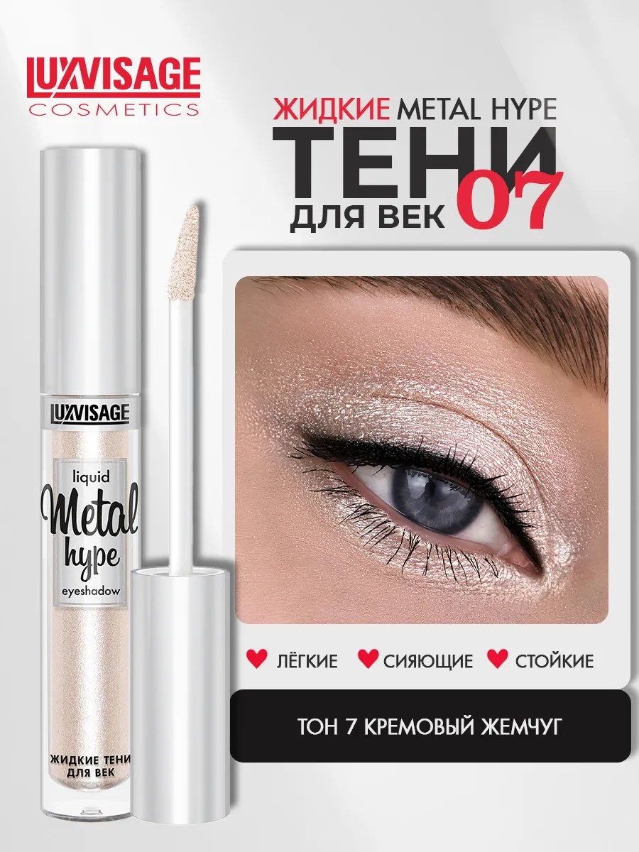Long-lasting liquid eyeshadow "Metal Hype" from the Belarusian brand LUXVISAGE is an essential product for stunning eye makeup with a vibrant metallic shine. The weightless, creamy texture applies comfortably in a perfectly even layer, distributes evenly, builds up, and blends to the desired density, leaving no residue on the eyelids. Rich shades with a high content of pearlescent pigments create a dense, radiant finish from the first application, dry quickly, resist smudging or creasing, and maintain vibrant color all day long. The special formula allows for use without a primer. Easily removed with any makeup remover. Contains moisturizing and softening ingredients that gently care for delicate skin. For effective use, apply with an applicator or brush; for a translucent glow, blend with your fingertips. Luxe Visage decorative cosmetics from Belarus are of excellent quality and will be a wonderful addition to any woman's makeup bag.