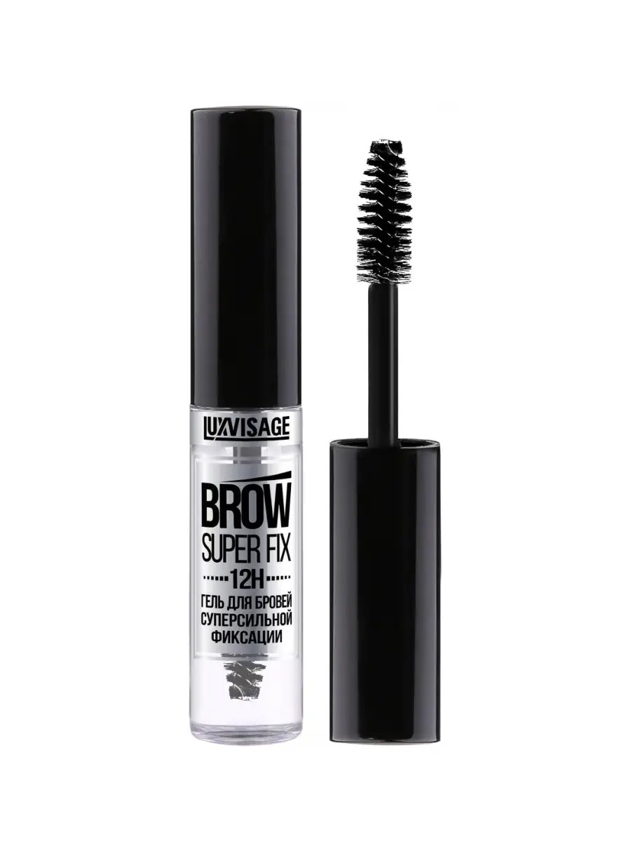 LUXVISAGE BROW SUPER FIX 12H Colorless Super Hold Eyebrow Gel. This gel guides brow hairs in the desired direction and holds even the thickest, coarsest, and most unruly brows in place for 12 hours. The transparent texture coats brows with a thin, invisible film, adding visual volume. It dries quickly, preserving the natural look of brows: no white cast, no clumping, and no "wet" effect. The dense nylon brush picks up the optimal amount of gel, distributes it evenly along the entire length of the brows, thoroughly combs through the brows, and shapes them to the desired shape. This gel can be used alone or after any brow makeup product to improve their hold. D-panthenol in the gel nourishes and moisturizes brow hairs, helping to improve their strength and elasticity.