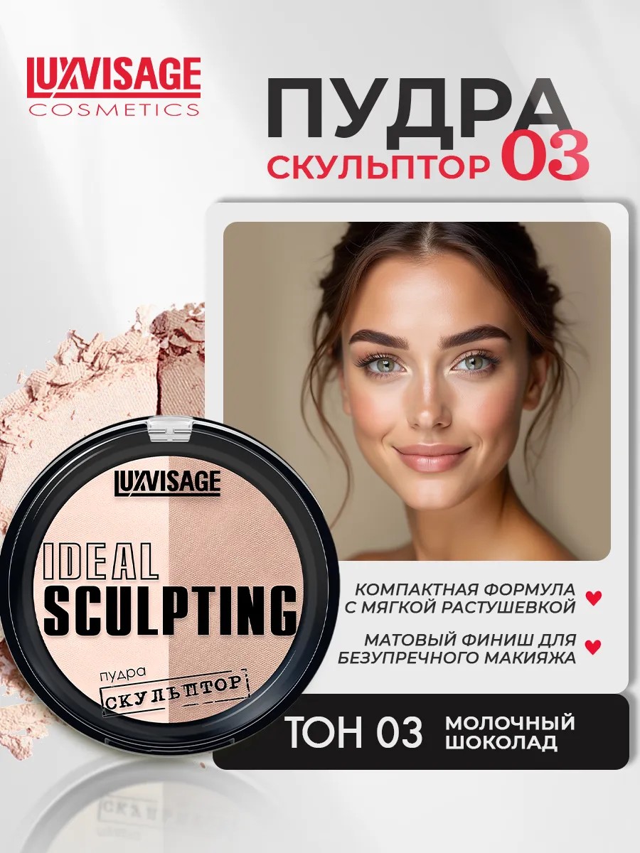 Пудра-скульптор тон 3 «Молочный шоколад» IDEAL SCULPTING от белорусского бренда LUXVISAGE — это идеальное решение для создания выразительного и гармоничного рельефа лица. Матирующая пудра для лица обладает легкой текстурой, которая позволяет легко наносить ее на кожу, обеспечивая естественный и стойкий результат. Двухцветная пудра-скульптор представлена в трех оттенках. Каждый из них состоит из светлого и темного оттенка, которые легко смешивать между собой, добиваясь максимально естественных линий. Темный оттенок скроет несовершенства, сделает контур лица более рельефным. Светлый оттенок подчеркнет и придаст объем лицу.Идеальные черты лица с помощью игры света и тени! Декоративная косметика для макияжа лица включает такие компоненты, как тальк, мика и каолин, которые помогают контролировать блеск и создают матовое покрытие. Экстракт листьев гамамелиса в составе способствует успокоению кожи и уменьшению воспалений, что делает пудру-скульптор не только декоративным, но и ухаживающим средством. Корректор для лица идеально подходит для скульптурирования лица, позволяя создать тонкие линии и акценты, подчеркивающие природные черты. С помощью палетки для скульптурирования лица вы сможете легко добиться эффекта легкого контурирования, придавая вашему макияжу глубину и объем. Нежная и пигментированная текстура скульптора отлично наносится и растушевывается, обеспечивая длительный и стойкий результат. Сухой скульптор для лица палетка LUXVISAGE прекрасно ложится на кожу, не создавая эффекта маски. Он идеально подходит как для повседневного использования, так и для создания более сложных образов. Белорусская косметика женская от Люксвизаж всегда радует своим качеством и доступностью, а пудра-скульптор станет незаменимым помощником в вашем арсенале для макияжа.
