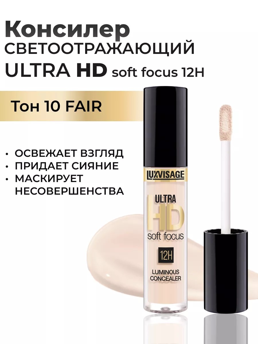 Light-reflecting face concealer ULTRA HD soft focus 12H, shade 10 fair (light beige, porcelain), from the Belarusian manufacturer of decorative cosmetics, LUXVISAGE (Lux Visage cosmetics). This concealer brightens and camouflages dark circles under the eyes, giving skin a natural radiance, providing 12-hour wear. The highly pigmented formula with a radiant effect brightens the eye area, camouflages dark circles and age spots, conceals redness, and gives skin a natural radiance. Functional fillers with interference and a soft focus effect scatter light, thereby "blending" optical irregularities and skin imperfections – "filling" wrinkles, reducing shadows, and refreshing the look. This creamy concealer is suitable for mature skin. It contains moisturizing ingredients - Vitamin E, glycerin, and the ElfaMoist complex - for prolonged skin hydration. Thanks to these, the concealer doesn't dry out or tighten the delicate skin of the eyelids. The creamy, medium-thickness texture reliably conceals imperfections, is easy to layer, feels effortless on the face, has increased longevity, and requires no touch-ups for 12 hours.
