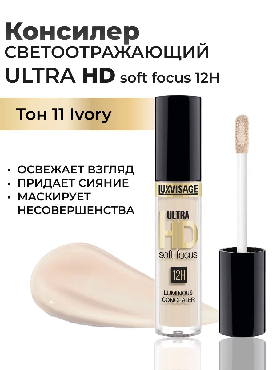 Светоотражающий консилер для лица ULTRA HD soft focus 12H тон 11 ivory (слоновая кость) от Белорусского производителя декоративной косметики бренда LUXVISAGE (Люкс Визаж косметика). Консилер осветляет и маскирует темные круги под глазами, придает коже естественное сияние, обеспечивая стойкость на протяжении 12 часов. Высоко пигментированная формула корректора с эффектом сияния осветляет область глаз, маскирует темные круги и пигментные пятна, скрывает покраснения, придает коже естественное сияние. Функциональные филлеры с интерференцией и эффектом мягкого фокуса рассеивают свет, тем самым «растушевывая» оптические неровности и недостатки кожи – «заполняют» морщины, уменьшают тени и освежают взгляд. Кремовый консилер подходит для возрастной кожи. В его состав входят увлажняющие компоненты - Витамин Е, глицерин и комплекс ElfaMoist обеспечивающие пролонгированное увлажнение кожи. Благодаря им консилер не сушит и не стягивает нежную кожу век. Кремовая текстура средней плотности надежно скрывает несовершенства, легко наслаивается, не ощущается на лице, обладает повышенной стойкостью и не требует коррекции в течение 12 часов.