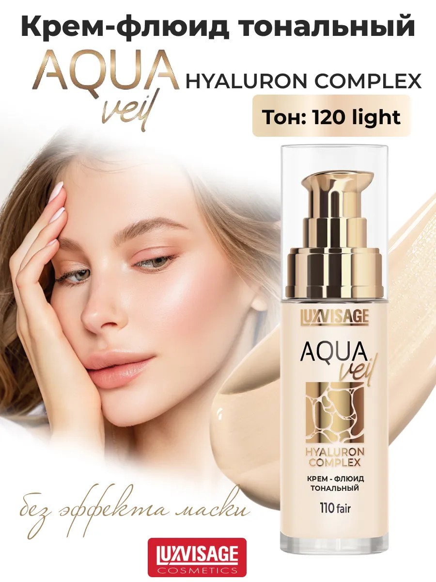 Увлажняющий тональный крем-флюид AQUA veil HYALURON COMPLEX (тон 120 fair) от Белорусского производителя декоративной косметики LUXVISAGE (Люкс визаж косметика). Невесомый словно вуаль, увлажняющий тональный крем-флюид создает тончайшее покрытие и моментально сливается с кожей. И в то же время, благодаря высокой пигментации, великолепно выравнивает тон лица.Инновационная формула крема с идеально сбалансированным комплексом светоотражающих и матирующих агентов дарит лицу деликатное сияние и легкую матовость. Функциональные светоотражающие наполнители со специальной обработкой придают коже визуальный эффект непревзойденной гладкости - выравнивают текстуру, скрывают поры и мелкие морщинки. Увлажняющий комплекс HymagicTM-4D на основе 4 видов гиалуроновой кислоты обеспечивает коже глубокое увлажнение, повышает упругость и эластичность.Обладает повышенной стойкостью, не требует коррекции в течение дня. Крем флюид с бежевым оттенком создает тонкое покрытие, идеально выравнивает тон лица, увлажняет, придает упругость, наполняет кожу лица деликатным сиянием. Нанесите легким движением крем-флюид на кожу лица, равномерно распределив спонжем, кистью или пальцами.