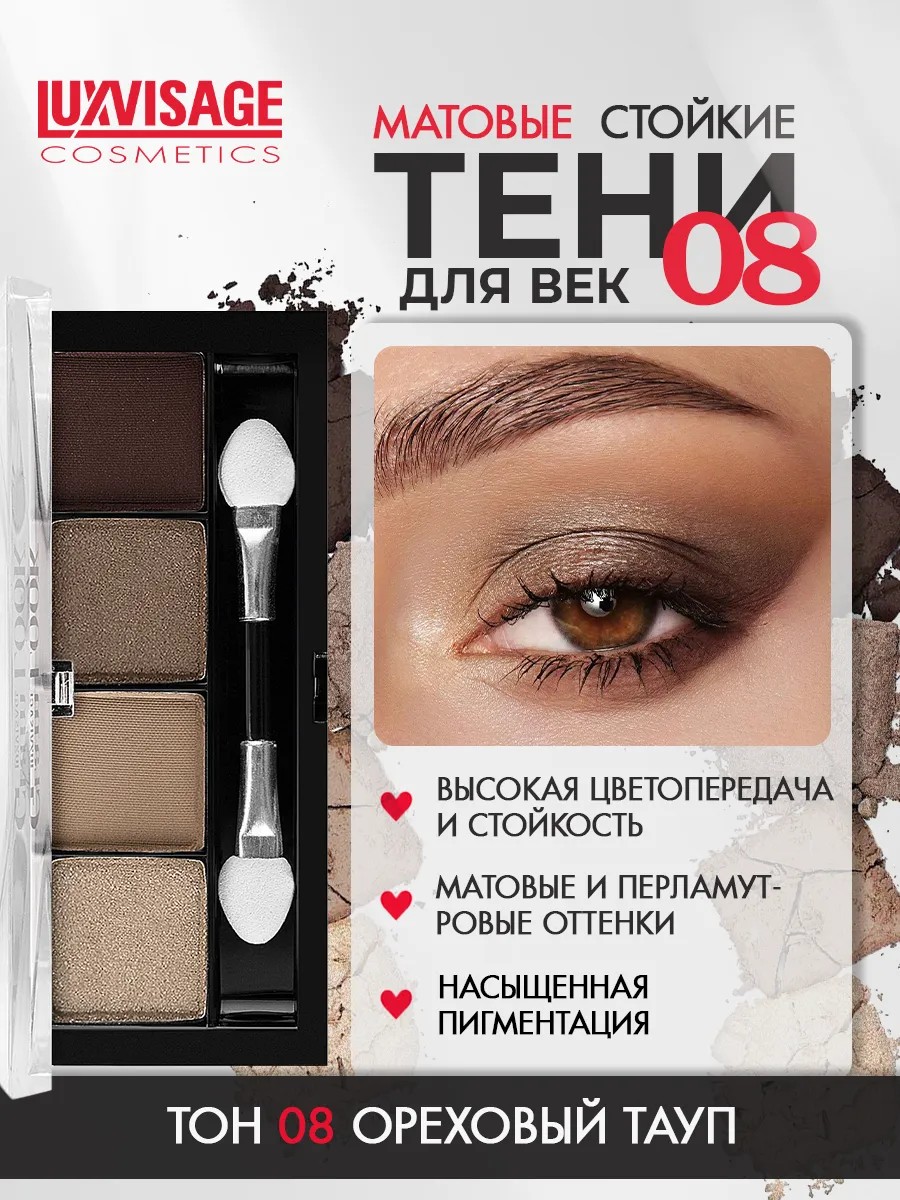 The Glam Look eyeshadow palette from the Belarusian brand Luxvisage features four harmoniously coordinated shades with matte and pearlescent finishes, allowing you to create both discreet nude daytime makeup and striking evening looks. These matte, brown, and pink eyeshadows apply easily and blend flawlessly into a soft haze. They create a perfectly smooth, even finish. This makeup product delivers rich color from the first application. This nude eyeshadow palette boasts exceptional staying power. The vibrant shadows retain their intense color throughout the day without flaking. The long-lasting formula contains witch hazel extract, which has antibacterial, soothing, toning, and softening properties, making it suitable even for sensitive eyelids. Directions: Apply eyeshadow to eyelids with an applicator or flat brush. Blend the edges with a soft, fluffy brush. Apply the lightest shade to the mobile eyelid, inner corner, and under the brow bone. Use the medium shade to highlight the crease of the upper and lower eyelids. Use the darkest shade to highlight the outer corner of the eye and lash line. For longer-lasting color and more intense results, apply an eyeshadow primer to your eyelids first. Products from this Belarusian brand, whose skincare and decorative cosmetics are always a guarantee of quality and a favorite of many customers. Put together a gift set of high-quality women's cosmetics, and it will be the perfect New Year's gift for your sister, mother, friend, girlfriend, or woman. We have special offers and sales, so you can buy our products as gifts at a discount! Belarusian cosmetics are a great alternative to Korean brands.