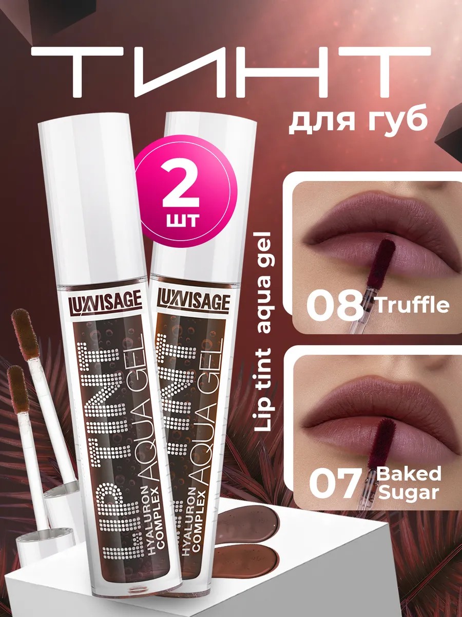 The matte liquid lip tint LIP TINT AQUA GEL hyaluron in shade 07 Baked Sugar and shade 08 Truffle from the Belarusian brand LUXVISAGE is an innovative cosmetic product with a hyaluronic complex, designed to moisturize, tone, and create a long-lasting color on the lips. The matte liquid format ensures easy application and even color distribution, which lasts a long time without drying out.
