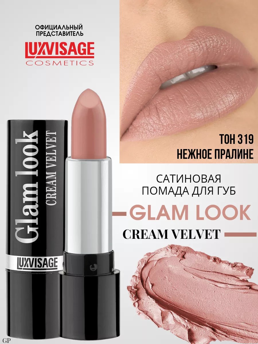 Сатиновая помада для губ GLAM LOOK от белорусского бренда косметики LUXVISAGE высокопигментированная бархатисто-кремовая текстура равномерно ложится на губы плотным комфортным покрытием.