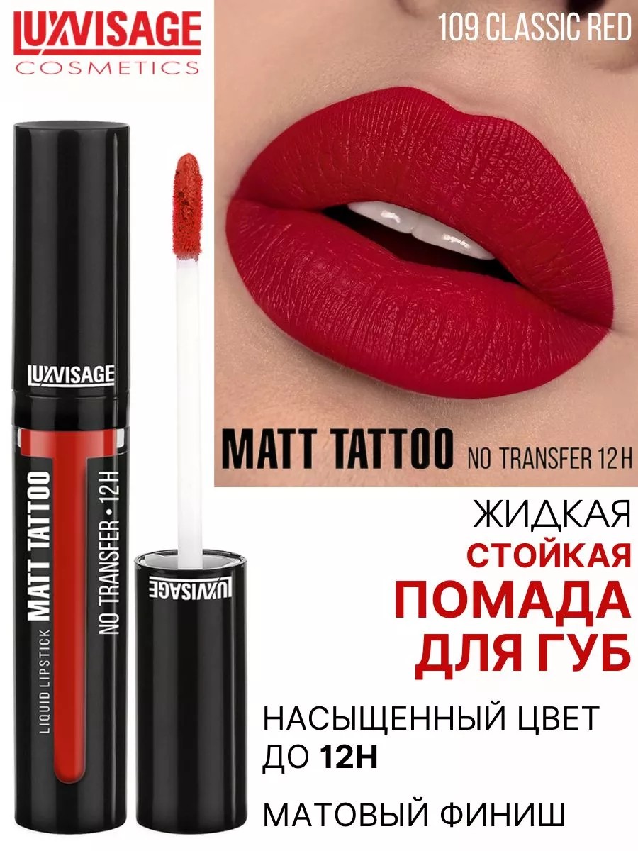 Жидкая помада для губ стойкая MATT TATTOO NO TRANSFER 12H тон 109 бренда Люкс визаж LUXVISAGE Белорусской косметики для макияжа подарит бережный уход за нежной кожей и ультраматовый финиш. Быстросохнущая пигментированная формула обемпечивает супер стойкость до 12 часов без отпечатков и потери интенсивности цвета. Увлажняющая губная помада с удобным аппликатором равномерно наносится и легко распределяется, не сбивается в складках, не растекается за контур, абсолютно не ощущается и не тускнеет в течение всего дня, не сушит и не стягивает кожу. Легкая флюидная текстура быстро высыхает, не отпечатывается и создает невесомое покрытие с бархатным матовым финишем. Высокопигментированные оттенки гарантируют высокую цветовую передачу, полностью перекрывают естественный цвет при нанесении в один тонкий слой.