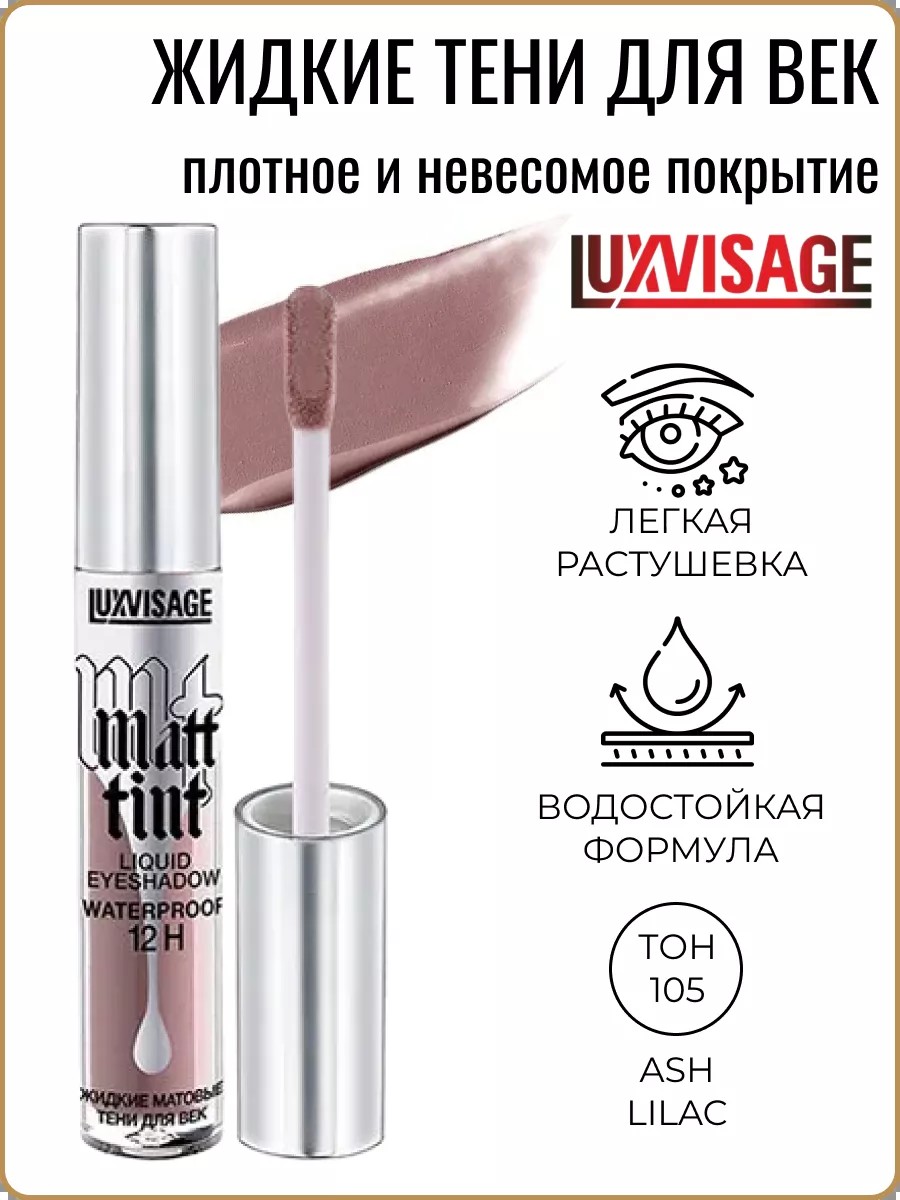 Matt Tint Waterproof Ash Lilac 12H liquid matte eyeshadow from Belarusian brand Luxvisage applies easily, applies evenly, dries quickly, and sets onto skin for a velvety matte finish.