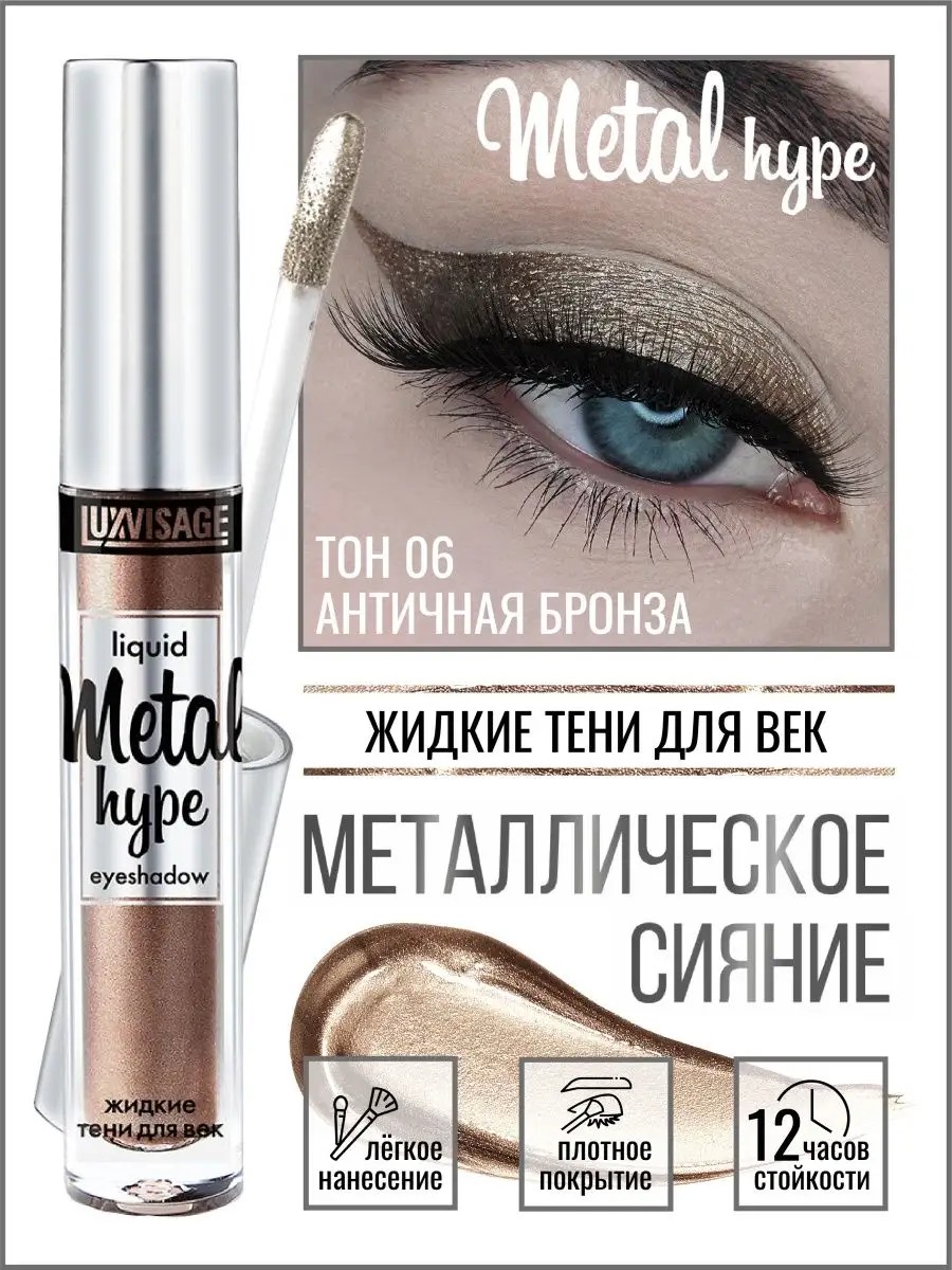 Сияющие жидкие тени для век "Metal hype" от от белорусского бренда Luxvisage, которые станут незаменимым элементом вашей косметички. Стойкие жидкие тени для век Metal hype — трендовый продукт для эффектного макияжа глаз с ярким металлическим сиянием. Тени для глаз идеально подходят как для создания повседневного, так и для вечернего макияжа. Благодаря своей уникальной текстуре, они легко наносятся и отлично растушевываются, обеспечивая равномерное покрытие и стойкий эффект. Быстро высыхают, сохраняют яркость цвета и сияния до 12 часов. Абсолютно легкие и невесомые, не ощущаются на веках. Не требуют основы (базы) под тени. Легко удаляются любым средством для демакияжа. Содержат увлажняющие и смягчающие компоненты. Жидкие тени для век обладают великолепным блеском, что делает их отличным выбором для тех, кто хочет добавить яркости и выразительности в свой образ. Декоративная косметика для макияжа женская идеально подойдут для создания различных эффектов – от легкой дымки до насыщенного металлического сияния. С помощью этих теней вы сможете подчеркнуть красоту своих глаз и выделиться в любой обстановке. Белорусская косметика женская Люксвизаж — это не только качество, но и доступность. Жидкие тени для век блестящие обеспечивают долгий срок носки без смазывания и потери яркости цвета. Тени для век стойкие являются отличным вариантом для подарка на 8 марта подруге или коллегам. Порадуйте своих близких женщин — маму, подругу или коллегу, подарив им этот стильный и практичный аксессуар для макияжа. Подарки на 8 марта всегда должны быть особенными, и такие блестящие тени станут прекрасным дополнением к любому праздничному образу. Добавьте в свою коллекцию эти тени для век и откройте новые горизонты в мире декоративной косметики. Сделайте шаг навстречу ярким и стильным образам с жидкими тенями для век "Metal hype" от белорусской косметики Luxvisage — это не просто косметика, это ваш новый уровень макияжа!