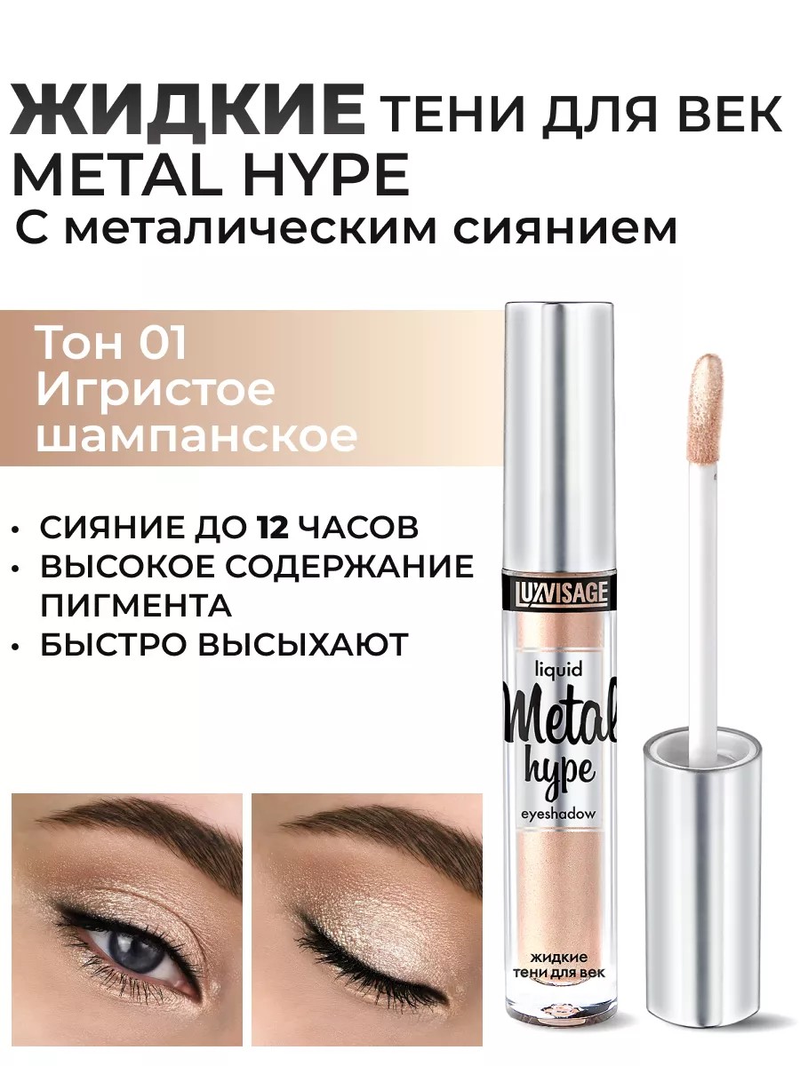 Metal Hype liquid eyeshadow with a metallic shimmer, shade 01 (sparkling champagne), from the Belarusian decorative cosmetics brand Luxvisage. This long-lasting Metal Hype eyeshadow is a trendy product for dramatic eye makeup with a metallic shimmer. Luxvisage eyeshadows contain rich colors with a high content of pearlescent pigments, creating a dense, radiant coverage from the first layer. The liquid gel texture allows you to create flawless eye makeup in just a couple of minutes. It applies incredibly easily and quickly in a perfectly even layer, builds evenly, and blends to the desired consistency—from a bright shimmer to a delicately luminous veil. These vibrant Belarusian Luxvisage metal hype eyeshadows dry quickly and retain their vibrant color and radiance for up to 12 hours. These pearlescent champagne eyeshadows are completely lightweight and weightless, leaving no trace on the lids. They require no primer or base. The metallic eyeshadows are easily removed with any makeup remover. These sparkling luxury makeup eyeshadows contain moisturizing and softening ingredients and make a wonderful gift for any occasion for your girlfriend, wife, or friend.