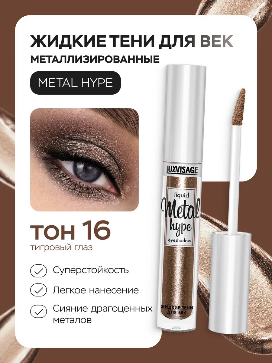 Жидкие блестящие кремовые тени для век Metal hype от LuxVisage- это топовый продукт для эффектного яркого макияжа глаз, обладающий глубоким сиянием благородных металлов.