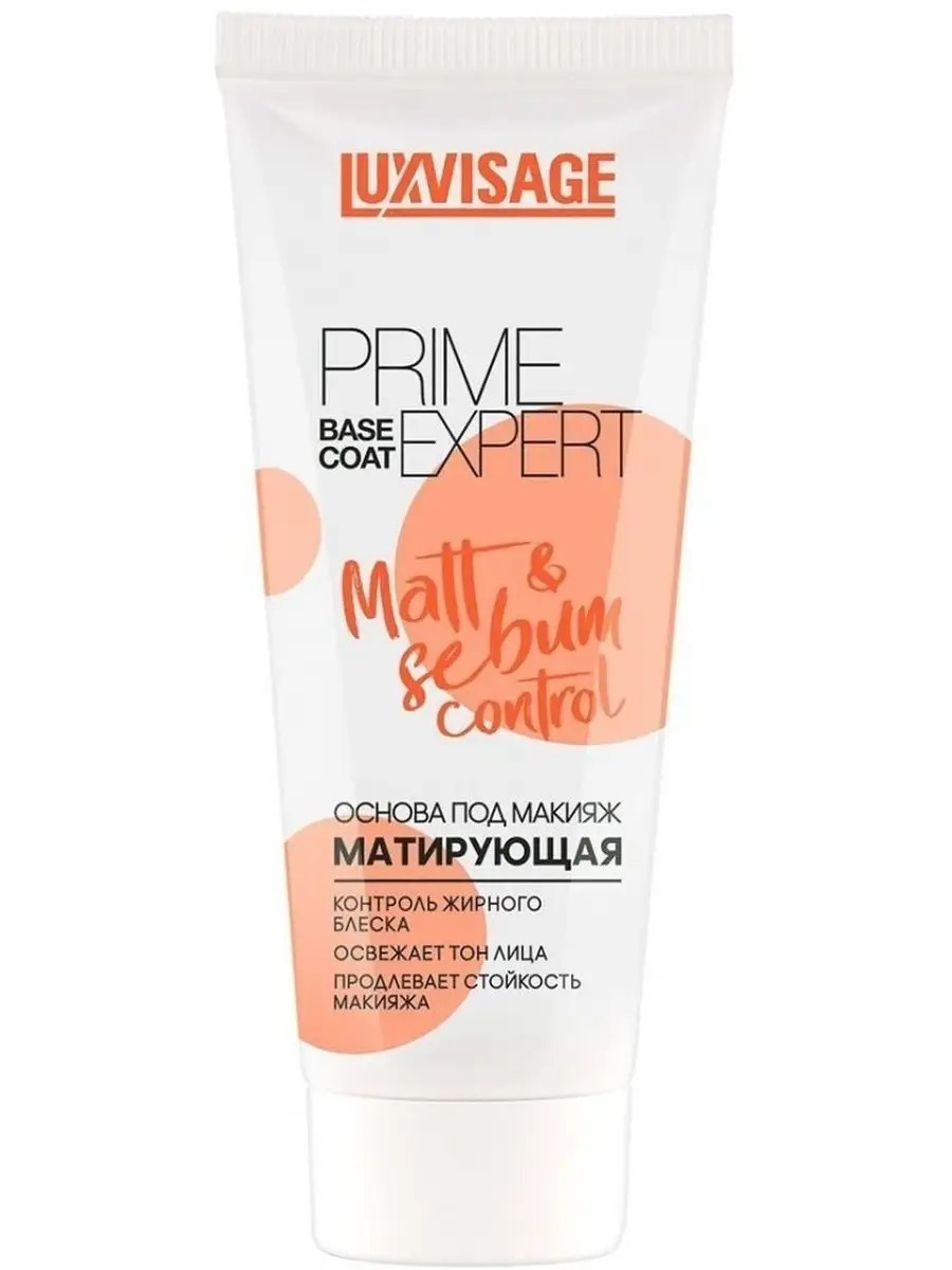 LXV LUXVISAGE PRIME EXPERT Matt & Sebum Control Peach Mattifying Makeup Primer - perfectly prepares combination and oily skin for foundation application. Leaves skin flawlessly matte, smooth, and velvety. A special complex of ingredients absorbs excess sebum, eliminates oily shine, and regulates sebum production throughout the day. At the same time, the product does not dry out, tighten, or emphasize skin texture. Thanks to the high-quality beige-peach pigments, the base corrects dull skin tone, evens out skin tone, conceals signs of fatigue, and gives the face a fresh, healthy appearance. Effectively evens out skin texture, smooths out enlarged pores and fine wrinkles. Ensures significantly easier and more even application of foundation or powder. Significantly prolongs the durability of facial makeup, preventing foundation from rolling and clogging pores and wrinkles.