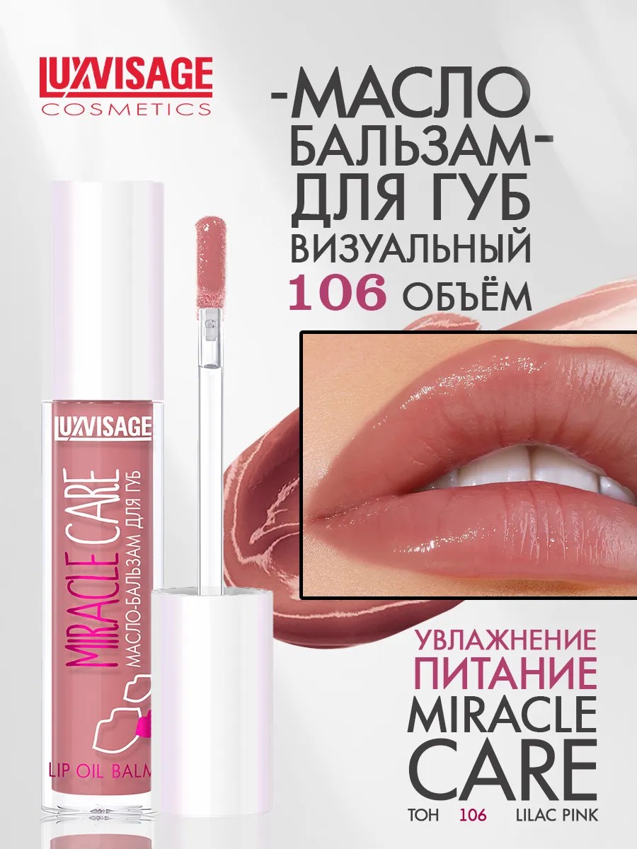 Масло для губ MIRACLE CARE тон 106 Lilac pink бренда Люкс визаж (Luxvisage) Белорусской косметики для макияжа интенсивно питает, увлажняет и тонизирует чувствительную кожу. Комфортная нелипкая текстура с глянцевым финишем дарит удовольствие при каждом нанесении. Бальзам снимает ощущение дискомфорта и сухости. Натуральные элементы - касторовое и миндально масло, витамин Е, ланолин, канделильский воск полноценно ухаживают за кожей в течение дня. Пушистый аппликатор - ложечка очень приятно скользит, равномерно наносится и распределяется, не растекается за контур. Полезные и лечебные компоненты предохраняют от обветривания и трещин, разглаживают неровности и шелушения, создают покрытие с зеркальным сиянием и дают эффект увеличения. Благодаря легкому скольжению и тающей, не липкой консистенции превращает обычный уход в истинное наслаждение.
