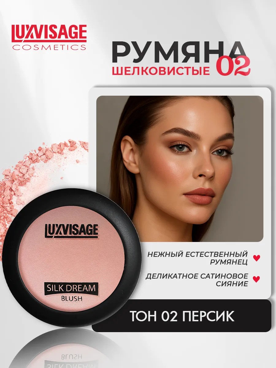 Matte blush from the Belarusian brand Luxvisage is perfect for both everyday use and special occasions. This compact, peach-toned blush will last all day, which is especially important for the modern woman. This pink blush will refresh and contour your face, highlight your cheekbones, and accentuate your features. The lightweight, silky texture of this women's blush glides on smoothly and blends easily. This matte blush offers medium pigmentation, delicate shades, and lasts for over 4 hours. This women's blush is easy to layer and blends flawlessly, allowing you to customize coverage from translucent to medium. Delicate satin shades impart a natural, healthy glow, gently accentuate your features, and refresh you, creating a well-rested and well-groomed look. A beauty gift box featuring our cosmetics is the perfect gift for a sister, a girl, or an adult woman. We have promotions and sales, you can buy our products as gifts at a discount!