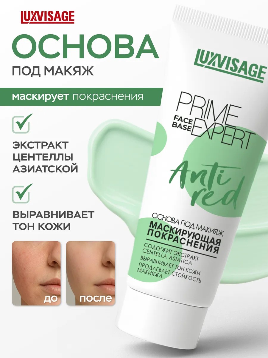 База под макияж маскирующая покраснения PRIME EXPERT Anti red зеленая сочетает в себе функции праймера и корректора. Содержит зеленые пигменты, которые визуально нейтрализуют и маскируют воспаления и покраснения на лице (расширенные сосуды, акне и постакне), выравнивая тон кожи.Благодаря содержанию высокоэффективных полимеров основа идеально сглаживает поры, мелкие морщинки и другие неровности кожи лица. Безупречно матирует кожу, контролирует выработку себума и предотвращает появление жирного блеска в течение дня.Быстро фиксируется после нанесения, не оставляет ощущения липкой или жирной пленки, не сушит и не стягивает кожу. Обеспечивает более легкое и равномерное распределение тонального крема или пудры и значительно продлевает их стойкость. Запатентованный компонент TALADVANC - экстракт центеллы азиатской - способствует выравниванию тона лица, придает естественное здоровое сияние, поддерживает оптимальный уровень увлажненности кожи.
