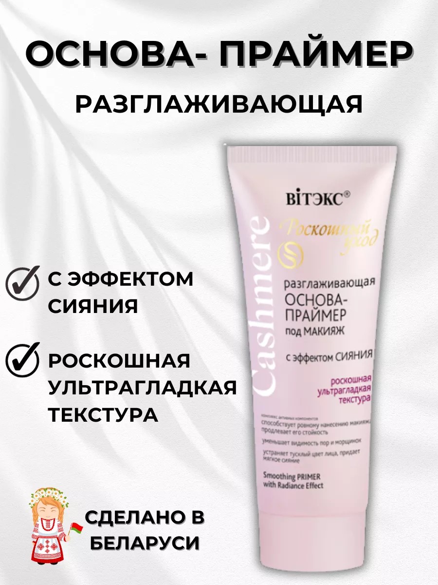 Разглаживающая ОСНОВА-ПРАЙМЕР под макияж С ЭФФЕКТОМ СИЯНИЯ серии Cashmere от белорусского бренда Витэкс специально разработана для ухода за кожей Почувствуйте впечатляющее преображение с уникальной основой праймером, которая помогает подготовить идеальную поверхность для макияжа и продлевает его стойкость. Роскошная ультрагладкая текстура легко распределяется по коже, заполняет видимые морщинки и неровности, визуально совершенствует кожу и создает восхитительное шелковистое покрытие, при этом позволяя коже дышать. Нежные перламутровые частицы позволяют выгодно подчеркнуть достоинства и фактуру лица. Кроме того, основа праймер содержит богатый коктейль питательных, увлажняющих, разглаживающих и антивозрастных веществ , которые образуют невесомый ухаживающий слой под макияжем, помогая сохранить совершенство кожи. Идеально сочетается с различными тонирующими средствами, препятствует скатыванию тонального крема, не дает ему собираться в порах и морщинках, позволяет сохранить безупречную свежесть макияжа в течение всего дня. Подходит для профессиональных техник макияжа, направленных на придание коже свежего отдохнувшего вида и совершенного сияния (стробинг, хроминг и др.). Приемы профессиональных визажистов еще никогда не было так легко использовать самостоятельно в домашних условиях! Впечатляющий результат базы под макияж: идеально ровное покрытие, безупречный макияж и свежий цвет лица. Как итог гладкая и упругая кожа, где морщинки и несовершенства менее заметны. Применение нанесите небольшое количество на кожу, равномерно распределите. Подходит для всех типов кожи для жирной, сухой, комбинированной и чувствительной. Будьте прекрасными вместе с брендом профессиональной косметики витэкс. В нашей линейке вы найдёте средства по уходу для всей семьи.