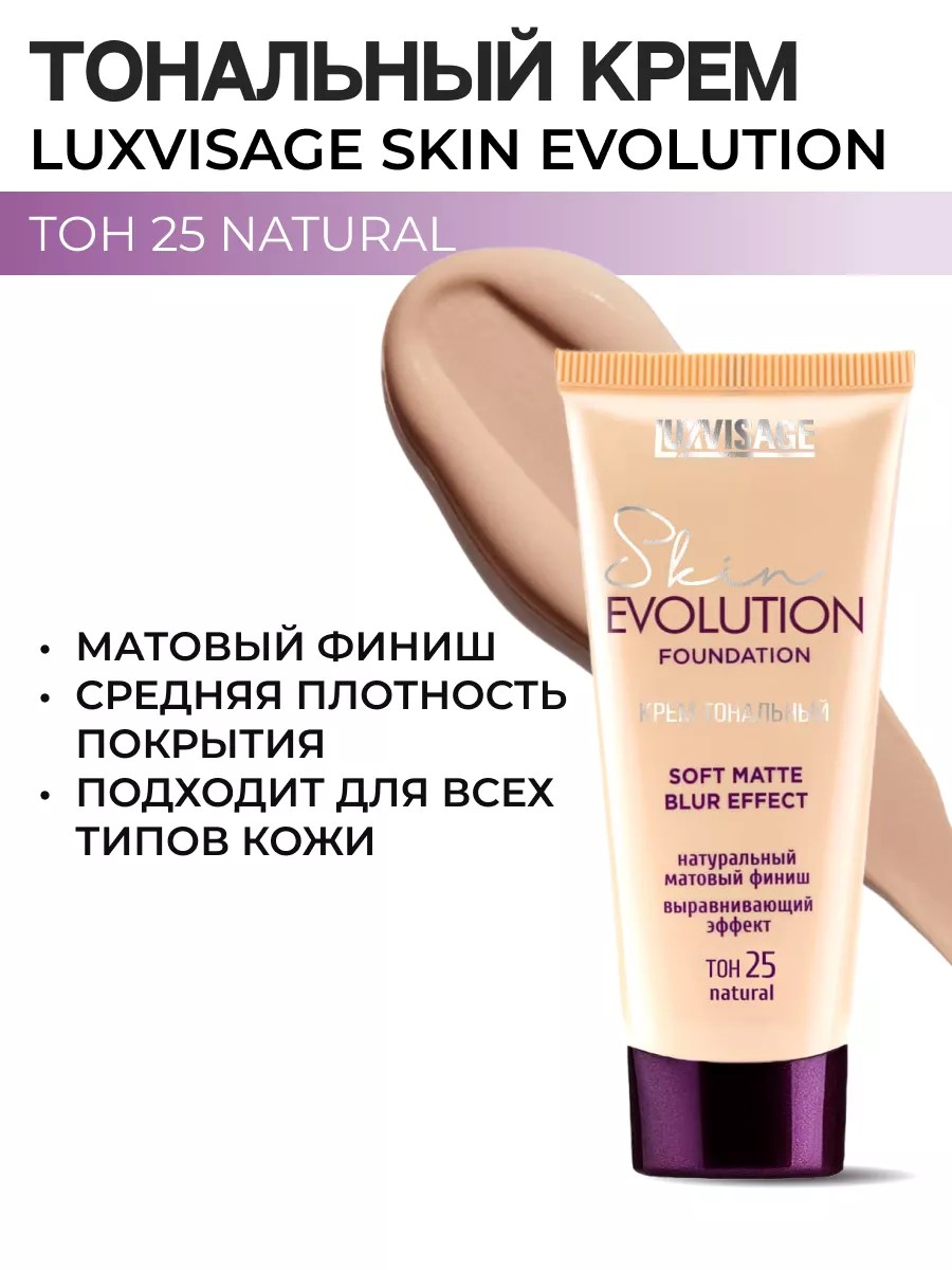 Тональный крем с натуральным матовым финишем и выравнивающим эффектом Skin EVOLUTION soft matte blur effect, тон 10 NATURAL (натуральный, естественный) от Белорусского производителя декоративной косметики LUXVISAGE (Люкс визаж косметика). Матирующий тональный крем от Luxvisage безупречно сливается с кожей и обеспечивает комфортное невесомое покрытие, придает коже «живой» матовый финиш, сохраняя максимальную естественность макияжа. Комфортная легкая текстура отлично распределяется, позволяя создать покрытие необходимой плотности – от средней до более плотной. Формула крема с пудровыми микросферами матирует и препятствует появлению жирного блеска. Придает коже мгновенный эффект размытого фокуса (blur effect), визуально разглаживает поверхность кожи, скрывает поры и мелкие морщинки. Выравнивающий тональный крем для лица белорусский обладает повышенной кроющей способностью, идеально выравнивает цвет лица, маскирует покраснения и пигментацию. Ухаживающая формула с инновационным увлажняющим комплексом ElfaMoist способствует глубокому и пролонгированному увлажнению в течение всего дня. Тональный крем для лица Luxvisage skin evolution идеально маскирует расширенные поры и мелкие морщинки, а также обладает повышенной стойкостью и не требует коррекции в течение дня.