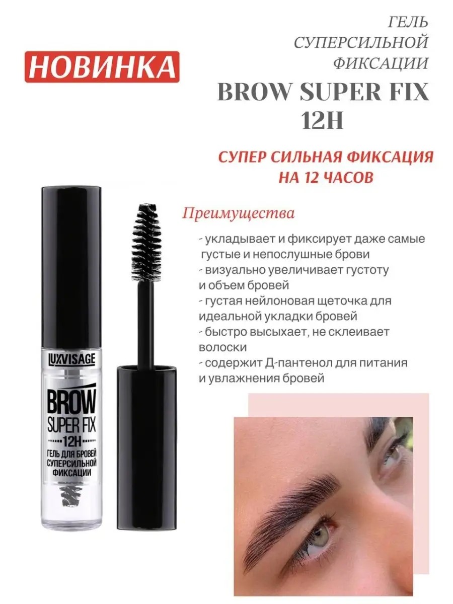Гель для бровей суперсильной фиксации brow super fix 12H luxvisage с тонкой щеткой, которая укладывает волоски бровей в нужном направлении и фиксирует даже самые густые, жесткие и непослушные брови на 12 часов. Гель фиксатор ламинатор для бровей люкс визаж прозрачный обволакивает волоски тончайшей невидимой пленкой, придавая бровям визуальный объем.