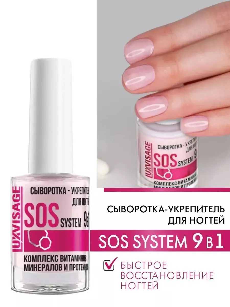 Multifunctional nail polish serum-strengthener SOS system 9 in 1 for rapid nail restoration. Deeply nourishes, moisturizes, and restores the nail plate. Fills microdamage, stimulating healthy nail growth. Contains an active complex of natural proteins, minerals, copper, iron, magnesium enzymes, acetyl methionine, calcium, and vitamins E, C, and F. Apply 1-2 coats to dry, clean nails at least twice a week as a base or topcoat.