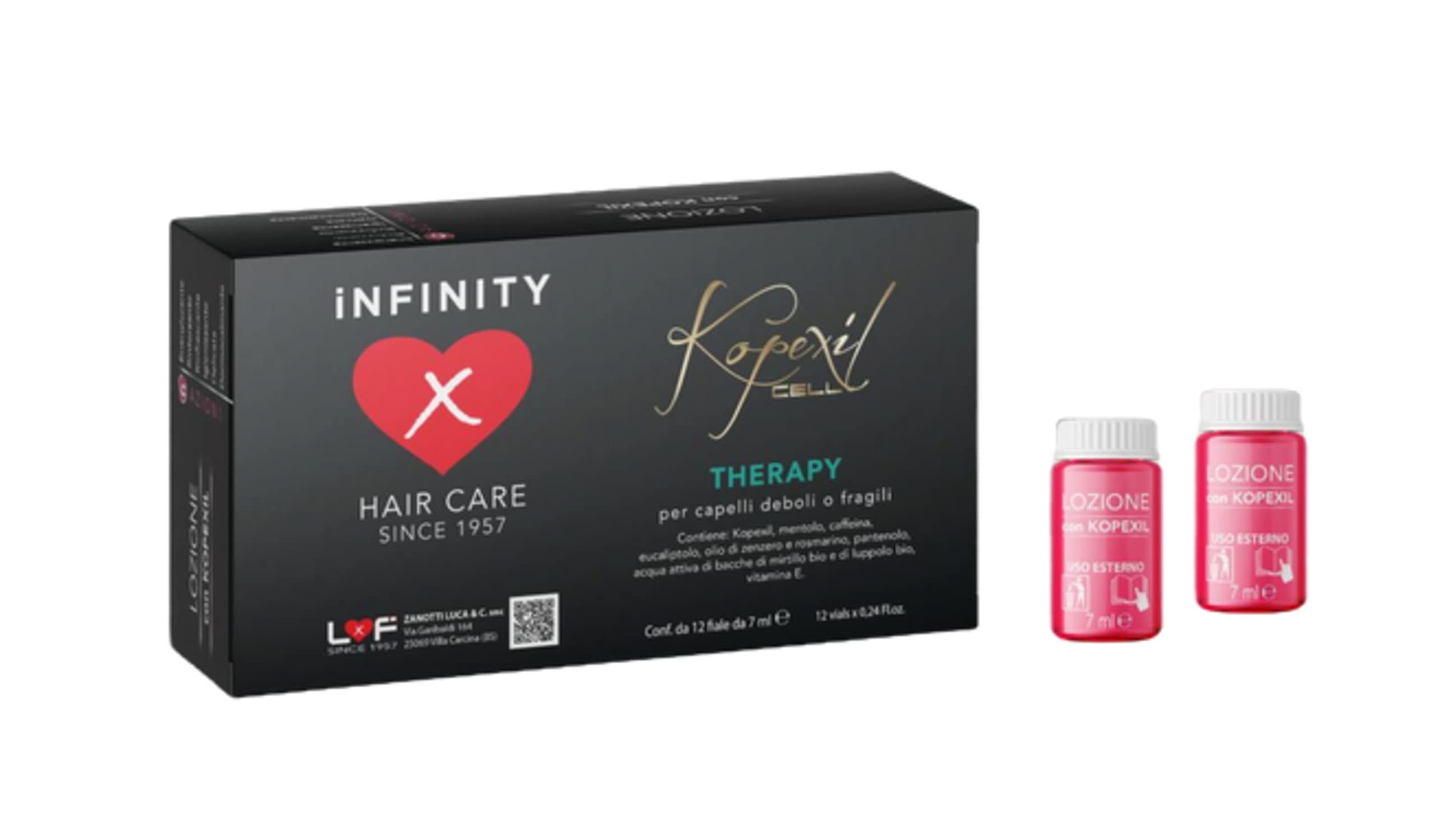 Infinity Kopexil Cell Therapy Pack of 12 x 7ml Ampoules. Intensive anti-hair loss treatment for weak or fragile hair with energizing, strengthening, refreshing, and disinfecting action. This is a 3-month treatment. Kopexil regulates and rebalances the hair at the root. Its direct action on the bulb aims to strengthen hair in the growth phase and provide support to combat weakening. Intensive 3-month treatment. INGREDIENTS Kopexil, menthol, caffeine, eucalyptus, ginger and rosemary oil, panthenol, organic hop and blueberry active water, vitamin E DIRECTIONS Apply the product to the skin after cleansing and massage until completely absorbed. Do not rinse. See morePack of 12 x 7ml ampoules. Recommended treatment cycle: Intensive phase: 3 applications per week for at least 3 months – Maintenance: 1 application per week for at least 1 month. Directions for use: Apply the product to the skin after cleansing and massage until completely absorbed. Do not rinse. Features: Intensive hydroalcoholic lotion with active ingredients (organic blueberry and hops active water, caffeine, rosemary and ginger essential oils, panthenol) with strengthening and reoxygenating properties for the hair bulb. The lotion is also enriched with menthol and eucalyptol for their disinfectant and refreshing action, and vitamin E with its known antioxidant properties. Kopexil regulates and rebalances the hair at the root. Its direct action on the bulb aims to strengthen hair in the growth phase and provide maximum support to reduce the hair suffocation process and stimulate thickening.LxF SINCE 1957 Infinity Hair Care Kopexil cell Terapy, traitement anti-chute intensif pour cheveux faibles ou cassants. Lot de 12 ampoules de 7 ml.DESCRIPTION DU PRODUIT DESCRIPTION DU PRODUIT Infinity Kopexil cell Therapy Lot de 12 ampoules de 7 ml Traitement de choc anti-chute intensif pour cheveux faibles ou fragiles à action énergisante, renforçante, rafraîchissante, désinfectante. C'est un traitement de 3 mois, Kopexil régule et rééquilibre le cheveu à la racine. Son action directe sur le bulbe vise à renforcer les cheveux en phase de croissance et fournir le soutien pour lutter contre leur affaiblissement. Traitement intensif pendant 3 mois INGRÉDIENTS Kopexil, menthol, caféine, eucalyptus, huile de gingembre et romarin, panthénol, eau active de houblon bio et myrtille bio, vitamine E MODE D'EMPLOI Appliquer le produit sur la peau après le nettoyage et masser jusqu'à absorption complète. Ne pas rincer Voir plusLot de 12 ampoules de 7 ml. Cycle de traitement recommandé : phase d'impact 3 applications hebdomadaires pendant au moins 3 mois – Maintien 1 application hebdomadaire pendant au moins 1 mois. Mode d'emploi : appliquer le produit sur la peau après le nettoyage et masser jusqu'à absorption complète. Ne pas rincer. Caractéristiques : lotion hydroalcoolique de choc avec principes actifs (eau active de baies de myrtille bio et de houblon bio, caféine, huiles essentielles de romarin et de gingembre, panthénol) aux propriétés renforçantes et réoxygénantes du bulbe pileux. La lotion est également enrichie en menthol et eucalyptol à action désinfectante et rafraîchissante et vitamine E aux propriétés antioxydantes connues. Le Kopexil régule et rééquilibre le cheveu à la racine. Son action directe sur le bulbe vise à renforcer les cheveux en phase de croissance et à fournir un maximum de soutien pour réduire le processus d'étouffement des cheveux et stimuler leur épaississement.