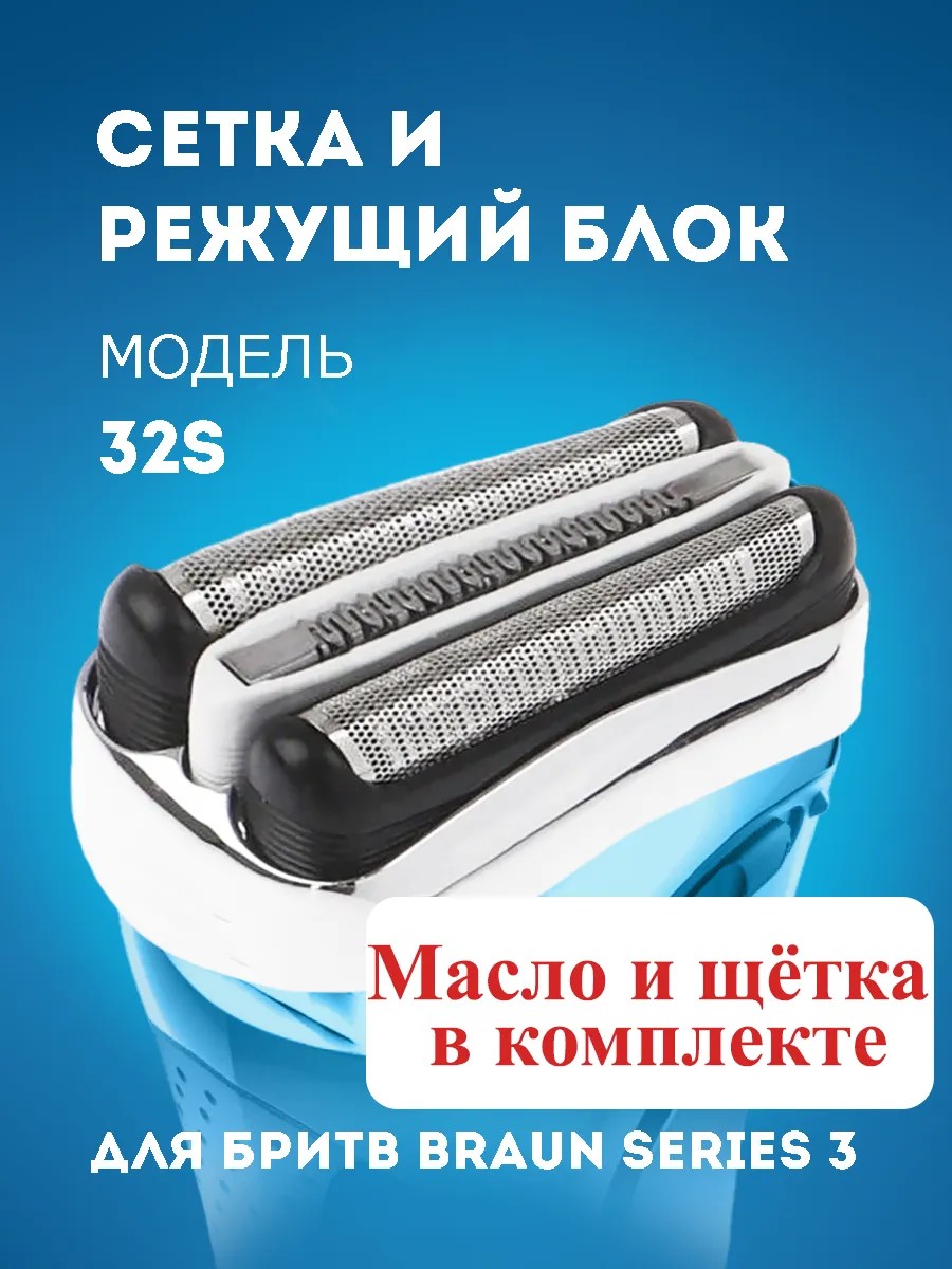 | Комплектация | Сетка и режущий блок для электробритвы Braun Series 3 32S - 1 шт; Щетка для очистки лезвий - 1 шт; масло обработка лезвий - 1 шт |