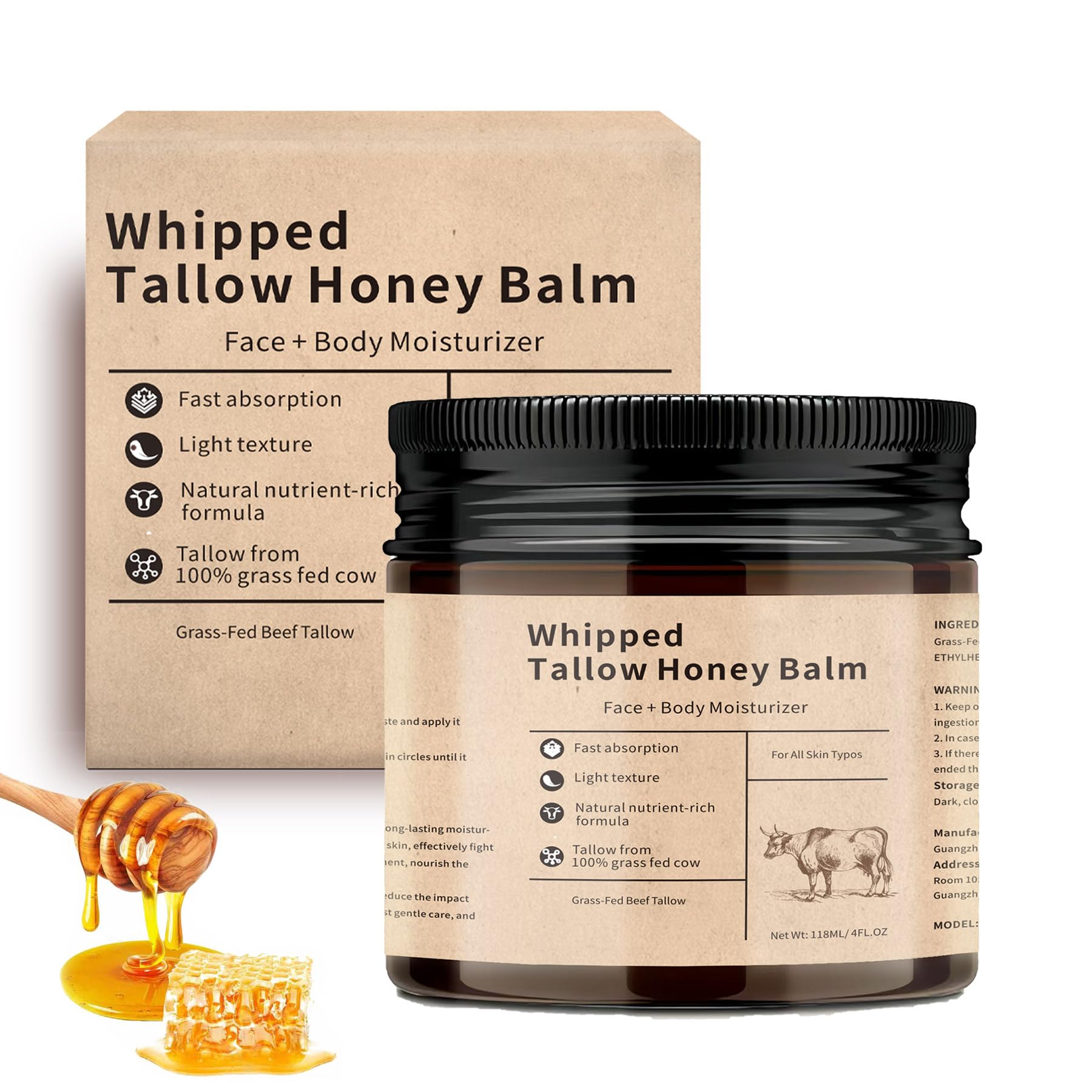 Easy to Use First wash the skin clean, apply natural tallow honey balm to the face or body, gently massage in circular motions until fully absorbed. Improve Skin Issues The beef tallow moisturizer can naturally address skin dryness, and other skin conditions, enhance the skin barrier, relieve redness and sensitivity, restore skin to a healthy state and promote youthful skin. Multi-Purpose It is perfect for use as a face cream, hand cream, foot cream or body cream. No matter where you apply it, the whipped texture absorbs quickly to provide long-lasting moisture and protection, it offers versatile skincare for all your needs. you can experience the whole body moisturizing, suitable for all skin, including sensitive skin. Light texture Fast Absorbing The tallow face moisturizer is free from essential oils, this formula is perfect for sensitive skin, offering strong moisturizing, soothing effect. The formulation absorbs quickly into the skin without leaving a greasy residue, providing a comfortable, non-oily feel after application. Natural Organic Ingredients Our tallow and honey balm is made with 100 grass-fed tallow and raw honey, without any chemicals. It is rich in high-quality olive oil, vitamin E, and Manuka honey, providing long-lasting and gentle moisturization, deeply nourishing your skin. These ingredients work synergistically to offer intensive hydration, soothe dryness, and repair damaged skin, revealing a naturally radiant glow.