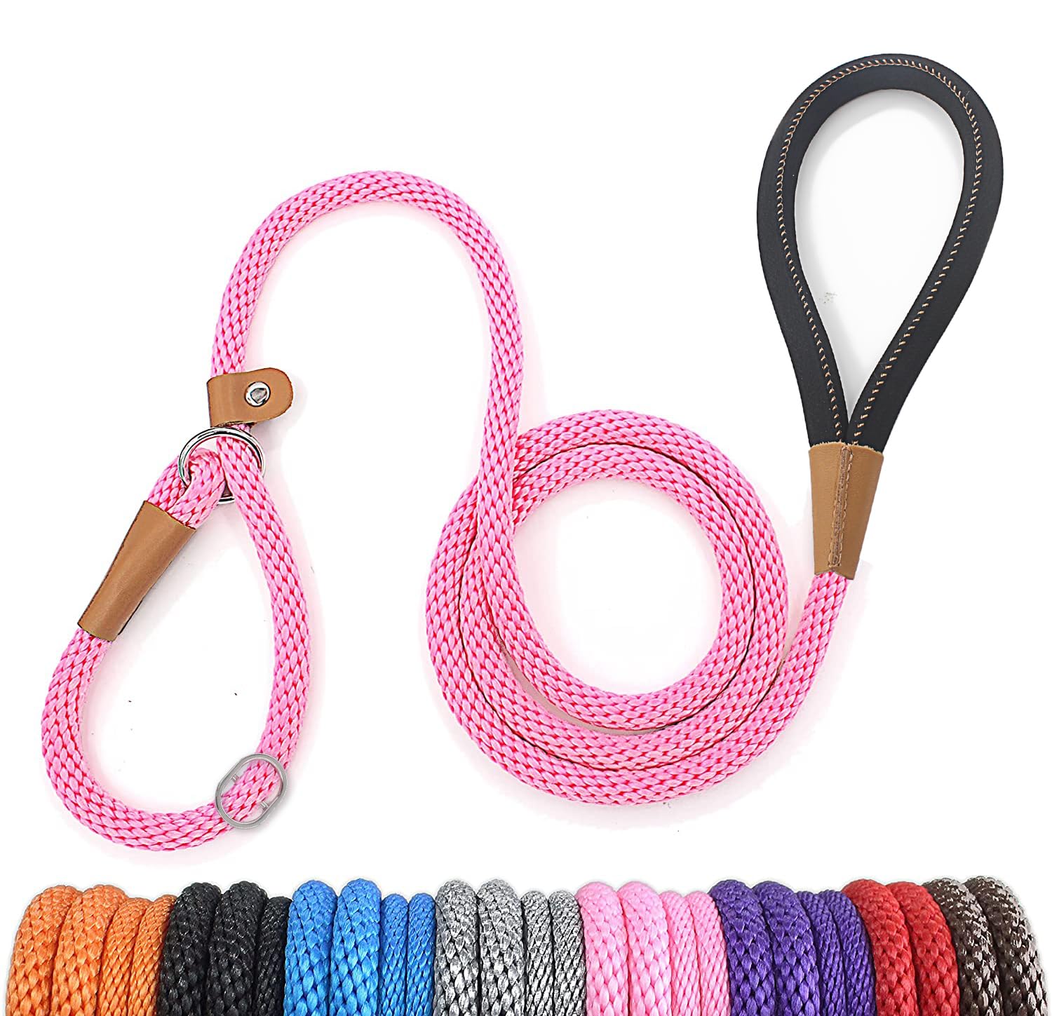 Choose your perfect size: Available in two thick sizes, 3 8 ""For small puppies, 1 2"" for medium and large races.Practically without a pull dog leash: easily prevent dogs without being damaged for the dog.You just have to keep your arm calm and the dog will stop when the tour becomes tight.Wait until your dog slows down and continue.He has proven to be effective for most dogs.Soft and smooth: made of high -quality polypropylene, the hand feels very pleasant and very soft, a little stretch and it is a buffer when you leash your heavy pulling dog.Strong and durable: Made with mountaineering rope, a heavy dog leash, after the examination the tensile strength of the rope 809 LBF can achieve, don't worry about broken and twisted damage.Easy and easy to use: British -style ropers, leash and collar in a design, adjustable to reach the neck size, easy and easy to use.