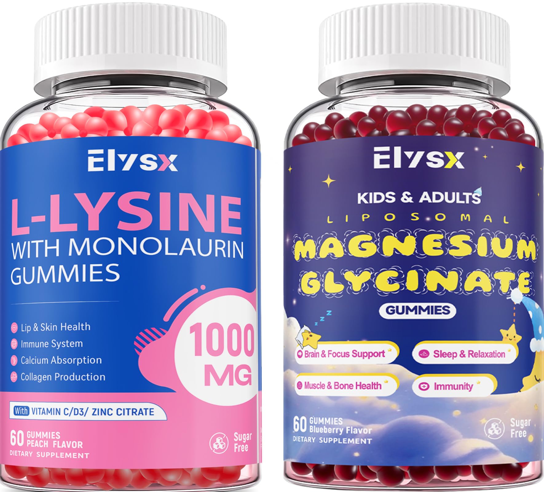 Produced in a GMP-certified facility, our supplements are carefully crafted from non-GMO ingredients to ensure purity and effectiveness. Made with pectin instead of gelatin, they are 100 gluten-free, dairy-free. Our magnesium glycinate supplement gummies are based in liposomal form, delivering your daily magnesium needs more efficiently. Magnesium Glycinate 400mg combined with Vitamin D3 and K2 work together to support bone and muscle health. Our chewable L-Lysine gummies are crafted to support your body's natural defenses while promoting overall wellness. Featuring a potent blend of L-Lysine, Monolaurin, Vitamin C, Vitamin D3, and Zinc, these ingredients work together to enhance immune function. Our magnesium glycinate 400mg gummies are a highly bioavailable form of magnesium. Compared to other forms of magnesium, magnesium bisglycinate stands out due to its higher bioavailability, being Gentle on the stomach, and support for muscle and bone health, Zzz, and relaxation. Each serving of our L-Lysine gummies contains 1000 mg of L-Lysine and 600 mg of Monolaurin (sourced from coconut oil), blending two potent ingredients to support your immune system and promote lip health.