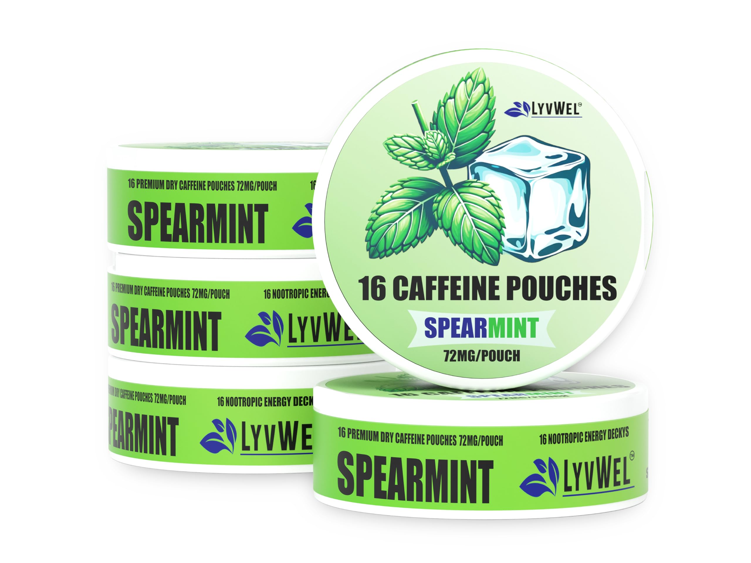 LyvWel 72mg Caffeine Energy Pouches Spearmint Refreshing Mint Energy with Guarana 5-Pack (80 Total Pouches) Spearmint 5 Pack